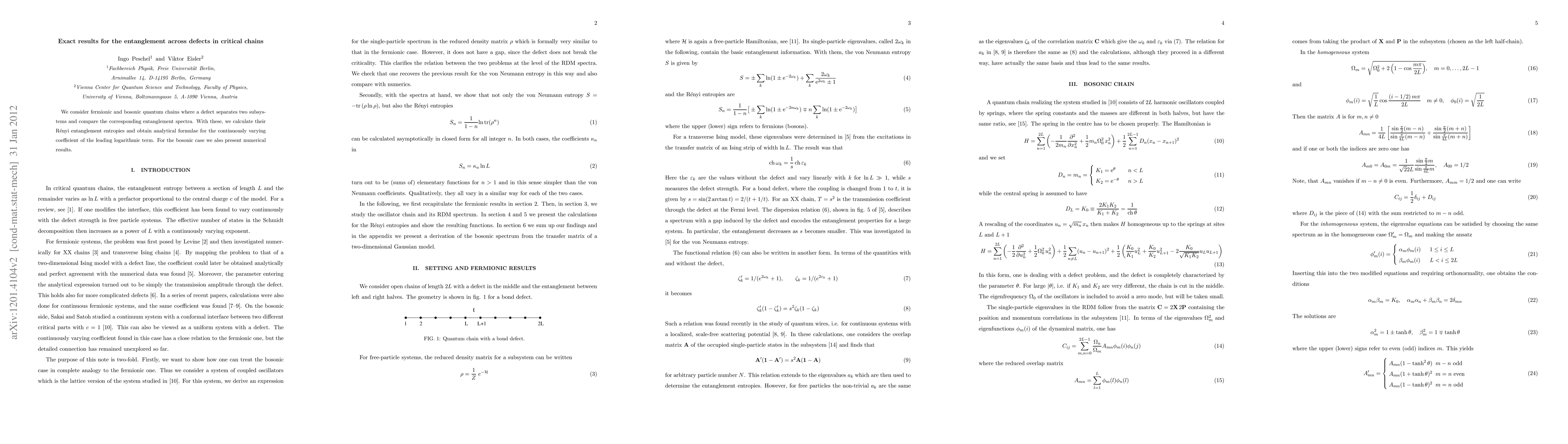 We consider fermionic and bosonic quantum chains where a defect separates two subsystems and compare the corresponding entanglement spectra. With these, we calculate their R\'enyi entanglement entropies and obtain analytical formulae for the continuously varying coefficient of the leading logarithmic term. For the bosonic case we also present numerical results.