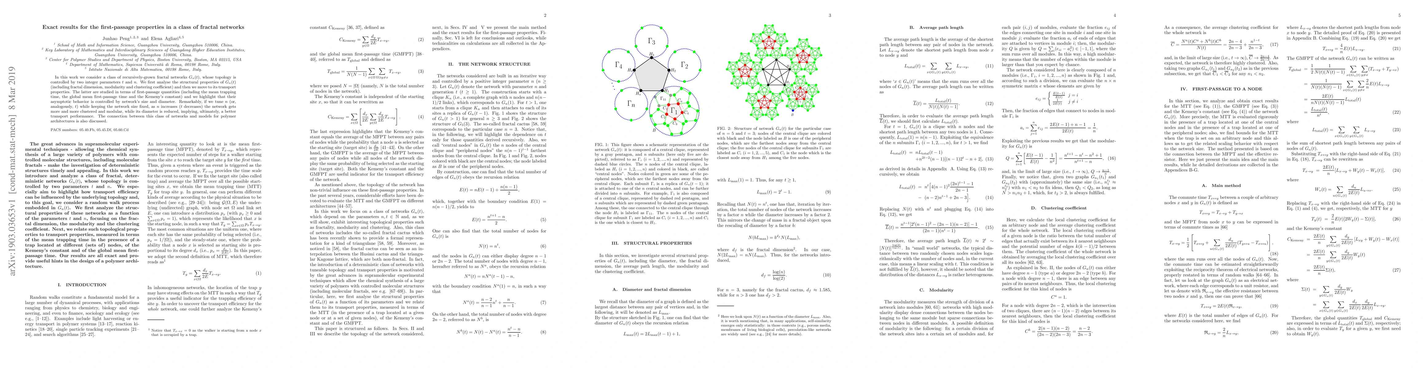 This paper analyzes fractal networks $G_n(t)$ and their structural and transport properties, focusing on first-passage quantities. It reveals that as network parameters change, the network's clustering and modularity increase while its diameter decreases, leading to improved transport performance.
