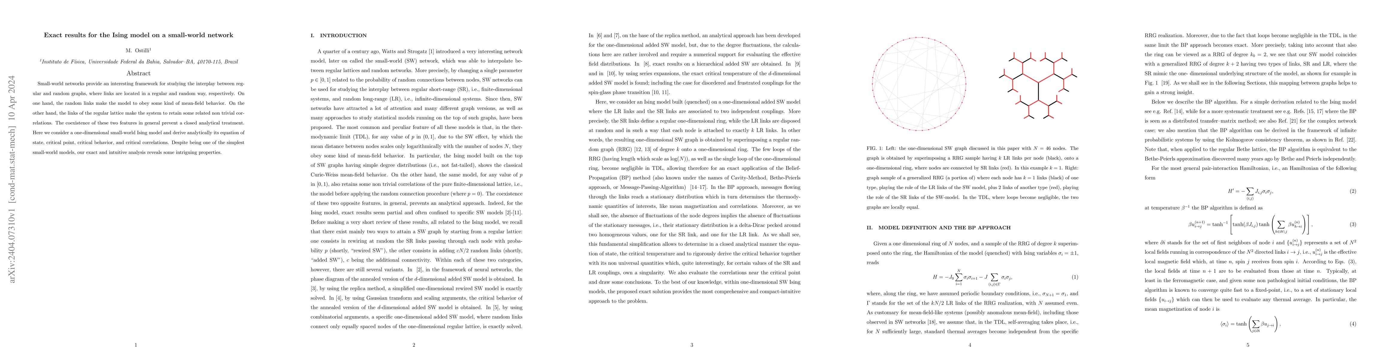 This paper provides an exact analytical treatment of the one-dimensional small-world Ising model, deriving its equation of state, critical point, critical behavior, and critical correlations. The study reveals intriguing properties arising from the interplay between regular and random links in the network.