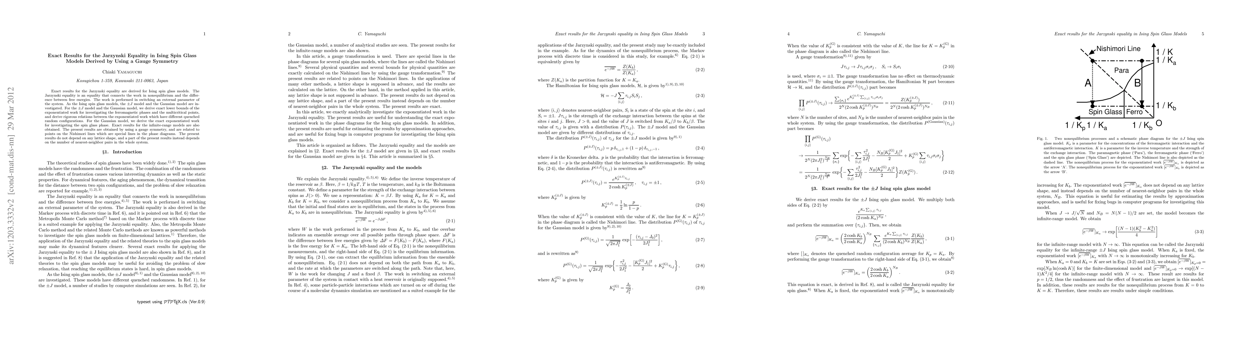 This paper derives exact results for the Jarzynski equality in Ising spin glass models using gauge symmetry, providing rigorous relations and lower bounds for the exponentiated work in ferromagnetic phases and multicritical points, and exact work for the spin glass phase. The findings are independent of lattice shape but partly depend on the number of nearest-neighbor pairs.