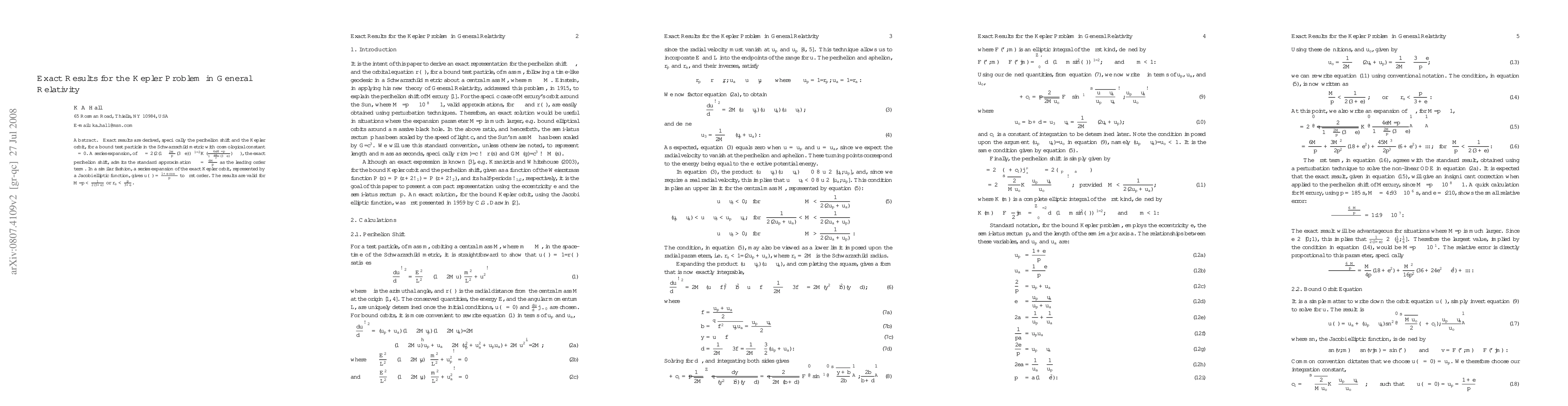 Exact results are derived, specifically the perihelion shift and the Kepler orbit, for a bound test particle in the Schwarzschild metric with cosmological constant $\Lambda=0$. A series expansion, of $\Delta\phi = 2(2(1-2M/p(3-e))^{-1/2} K((4eM/p)/(1-2M/p(3-e)))-\pi)$, the exact perihelion shift, admits the standard approximation $\Delta\phi=6M\pi/p$ as the leading order term. In a similar fashion, a series expansion of the exact Kepler orbit, represented by a Jacobi elliptic function, gives $u(\phi)=(1+e\cos\phi)/p$ to first order. The results are valid for $M/p<1/(2(3+e))$ or $r_s