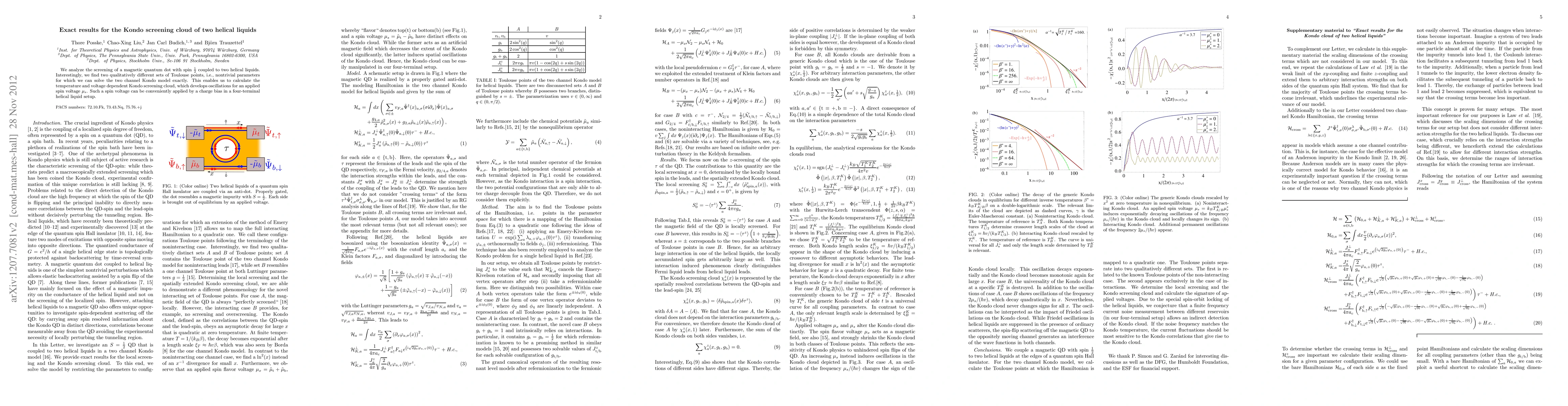 This paper investigates the Kondo effect in a magnetic quantum dot connected to two helical liquids, revealing two distinct sets of exact solutions for the two-channel Kondo model. It calculates the temperature and voltage-dependent Kondo screening cloud, which exhibits oscillations under a spin voltage applied via a charge bias in a four-terminal setup.