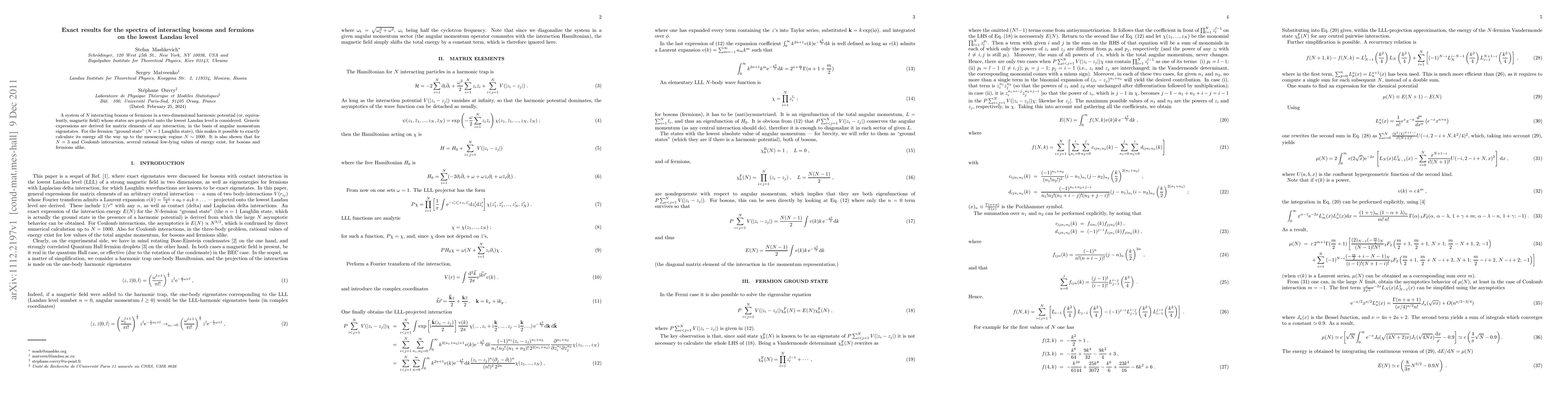 A system of N interacting bosons or fermions in a two-dimensional harmonic potential (or, equivalently, magnetic field) whose states are projected onto the lowest Landau level is considered. Generic expressions are derived for matrix elements of any interaction, in the basis of angular momentum eigenstates. For the fermion "ground state" (N=1 Laughlin state), this makes it possible to exactly calculate its energy all the way up to the mesoscopic regime N ~ 1000. It is also shown that for N = 3 and Coulomb interaction, several rational low-lying values of energy exist, for bosons and fermions alike.