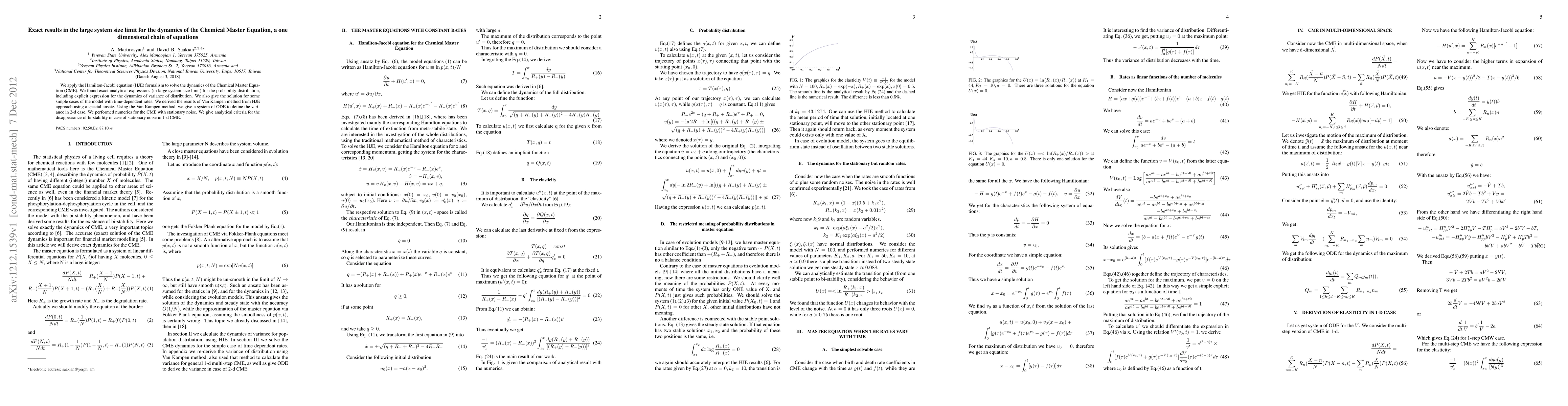 We apply the Hamilton-Jacobi equation (HJE) formalism to solve the dynamics of the Chemical Master Equation (CME). We found exact analytical expressions (in large system-size limit) for the probability distribution, including explicit expression for the dynamics of variance of distribution. We also give the solution for some simple cases of the model with time-dependent rates. We derived the results of Van Kampen method from HJE approach using a special ansatz. Using the Van Kampen method, we give a system of ODE to define the variance in 2-d case. We performed numerics for the CME with stationary noise. We give analytical criteria for the disappearance of bi-stability in case of stationary noise in 1-d CME.