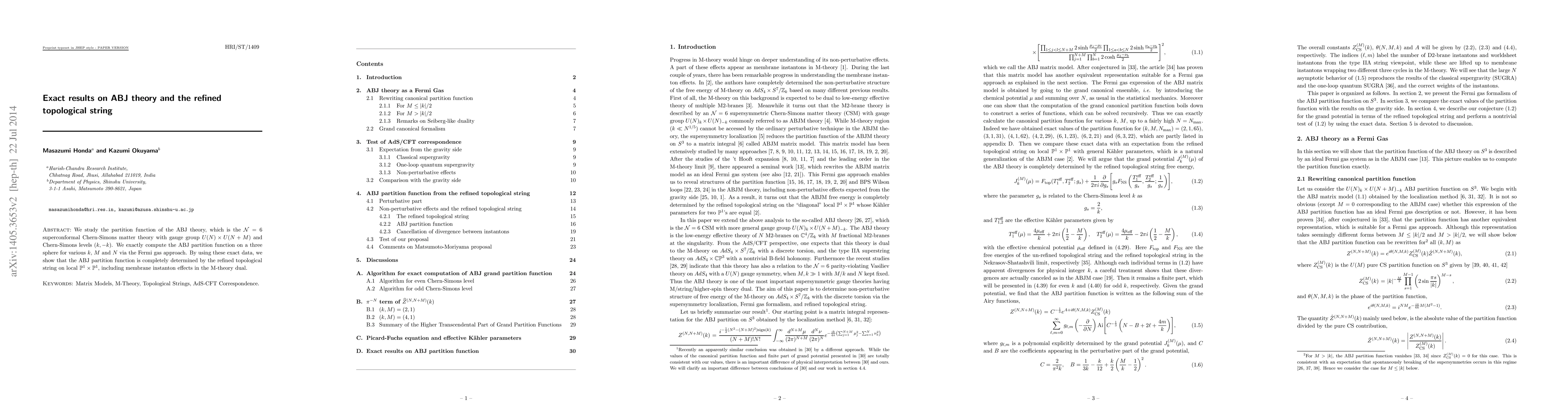 The paper presents an exact computation of the partition function for the ABJ theory using the Fermi gas approach and demonstrates that it aligns with the refined topological string results on local P^1 x P^1, including dual M-theory membrane instanton effects.