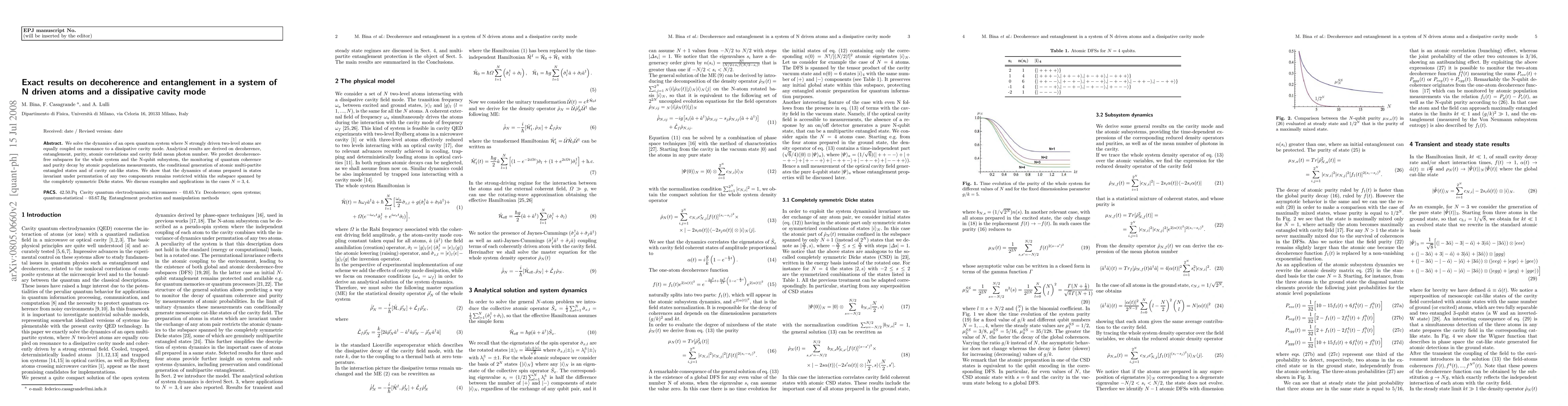 This paper analytically solves the dynamics of N strongly driven two-level atoms coupled to a dissipative cavity, deriving exact results on decoherence, entanglement, and purity. It predicts decoherence-free subspaces and methods for monitoring quantum coherence, and discusses the generation of entangled states and cat-like cavity states, with specific examples for N=3,4.