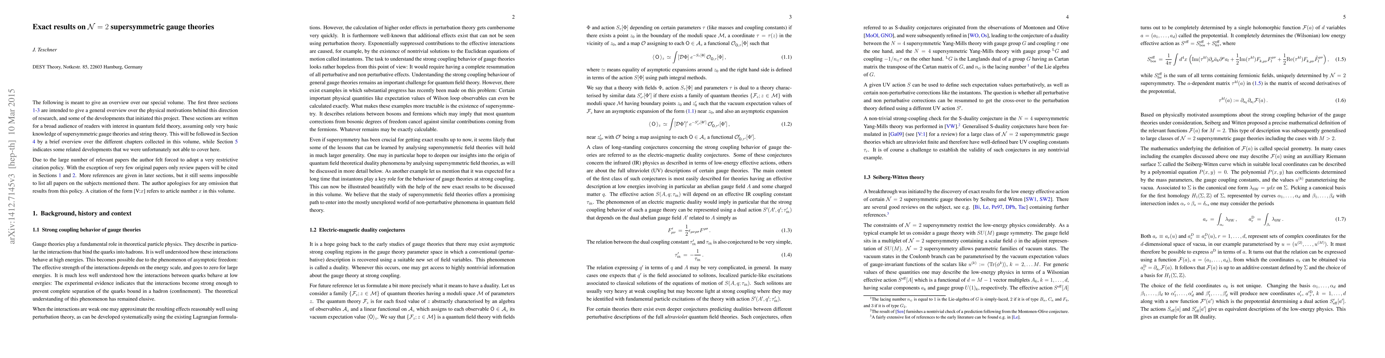 This paper introduces a collection of review articles on exact results in N=2 supersymmetric gauge theories, providing a broad overview of motivations and foundational developments in quantum field theory for a general audience. It also briefly outlines the structure of the volume and mentions related developments not covered.