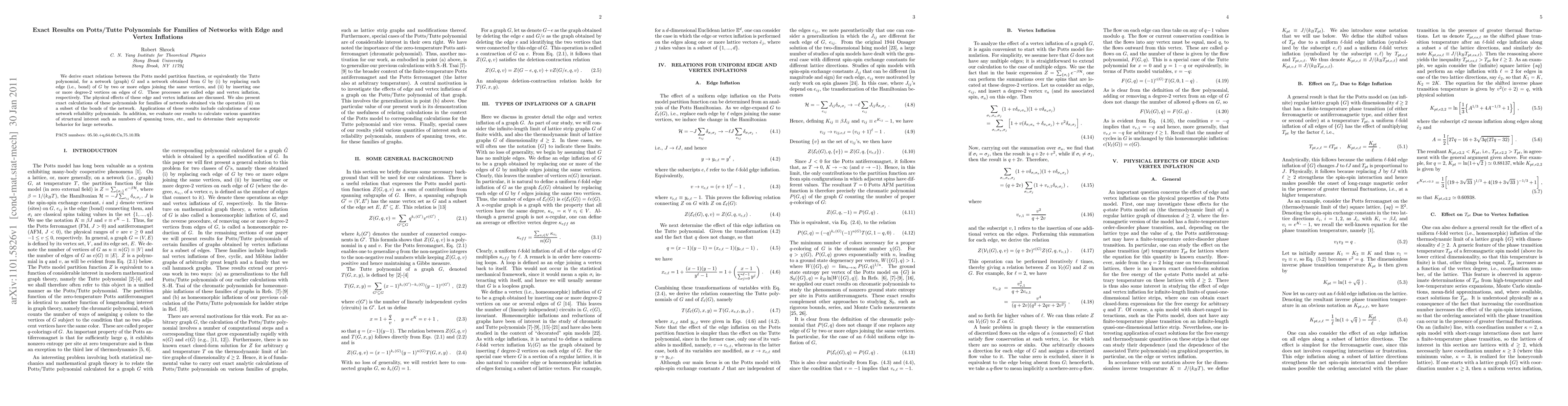 Researchers derived exact relations between Potts model partition functions for networks with edge and vertex inflations, enabling calculations of network reliability polynomials and structural quantities like spanning trees.