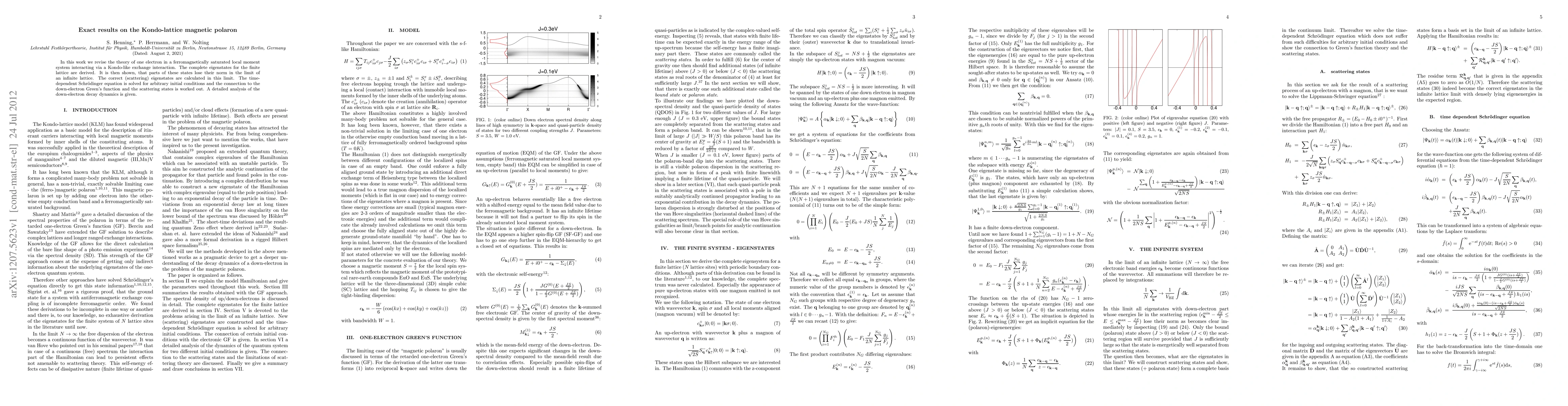 In this work we revise the theory of one electron in a ferromagnetically saturated local moment system interacting via a Kondo-like exchange interaction. The complete eigenstates for the finite lattice are derived. It is then shown, that parts of these states lose their norm in the limit of an infinite lattice. The correct (scattering) eigenstates are calculated in this limit. The time-dependent Schr\"odinger equation is solved for arbitrary initial conditions and the connection to the down-electron Green's function and the scattering states is worked out. A detailed analysis of the down-electron decay dynamics is given.