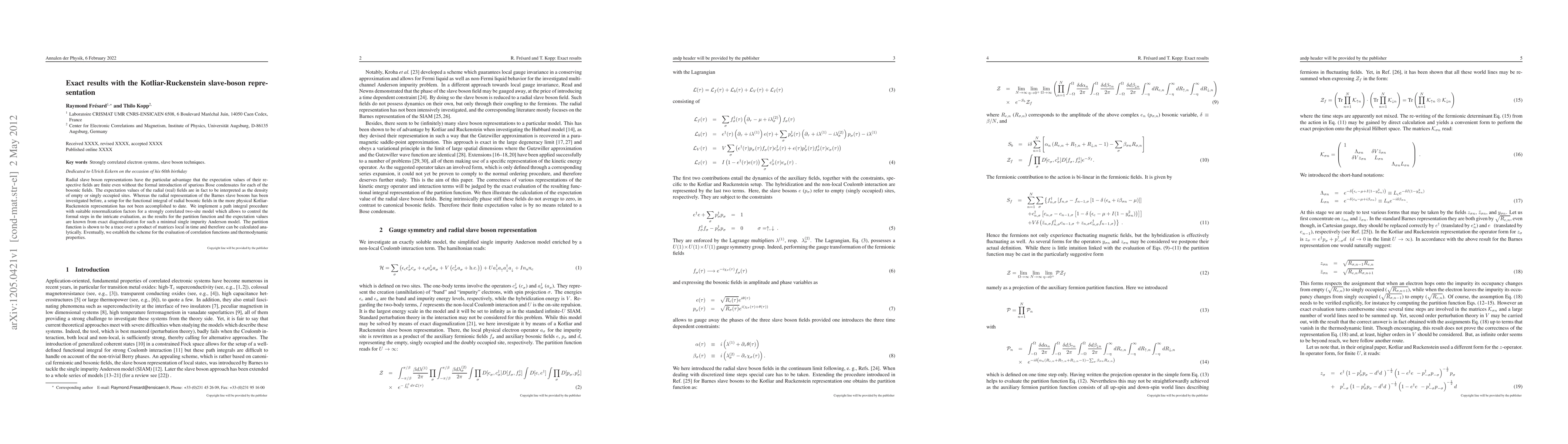 This paper presents a method for obtaining exact results using the Kotliar-Ruckenstein slave-boson representation in a strongly correlated two-site model. The radial slave boson approach allows for finite expectation values without introducing spurious Bose condensates, and the method is validated against exact diagonalization results.