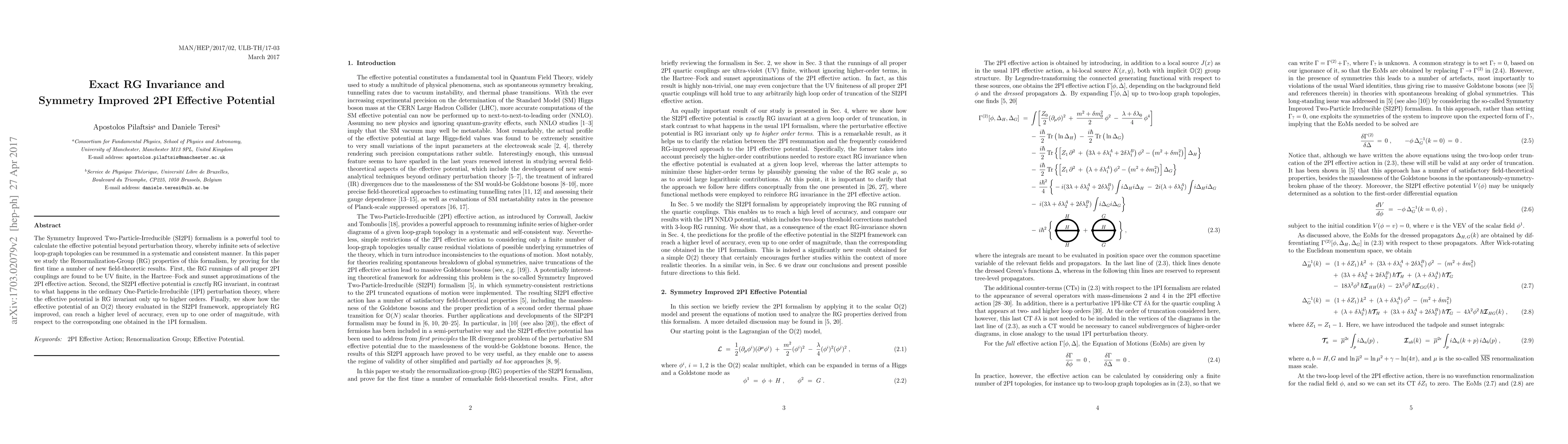The Symmetry Improved Two-Particle-Irreducible (SI2PI) formalism is a powerful tool to calculate the effective potential beyond perturbation theory, whereby infinite sets of selective loop-graph topologies can be resummed in a systematic and consistent manner. In this paper we study the Renormalization-Group (RG) properties of this formalism, by proving for the first time a number of new field-theoretic results. First, the RG runnings of all proper 2PI couplings are found to be UV finite, in the Hartree-Fock and sunset approximations of the 2PI effective action. Second, the SI2PI effective potential is exactly RG invariant, in contrast to what happens in the ordinary One-Particle-Irreducible (1PI) perturbation theory, where the effective potential is RG invariant only up to higher orders. Finally, we show how the effective potential of an O(2) theory evaluated in the SI2PI framework, appropriately RG improved, can reach a higher level of accuracy, even up to one order of magnitude, with respect to the corresponding one obtained in the 1PI formalism.