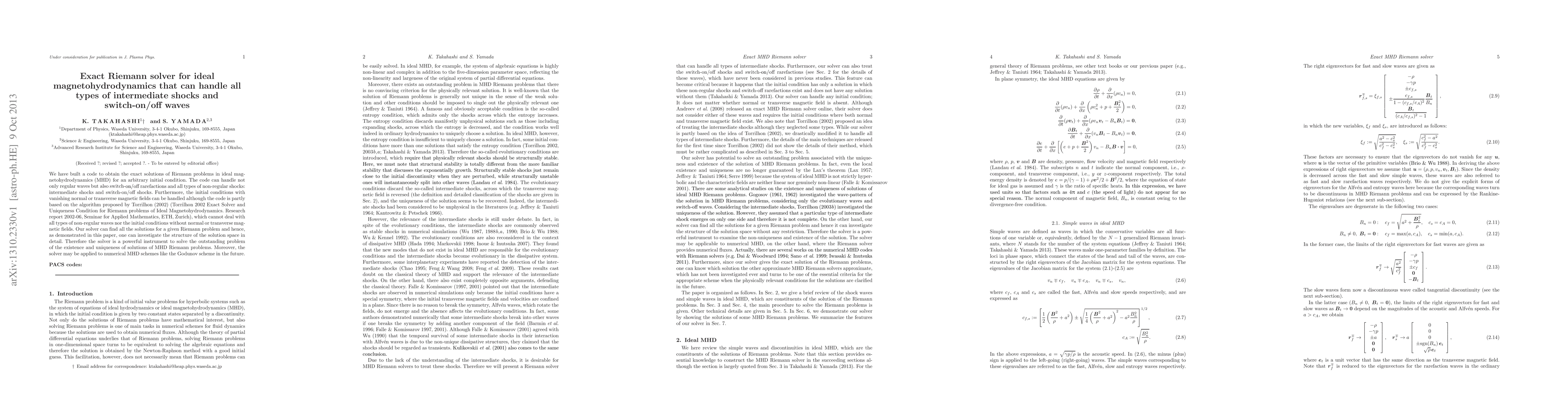 We have built a code to obtain the exact solutions of Riemann problems in ideal magnetohydrodynamics (MHD) for an arbitrary initial condition. The code can handle not only regular waves but also switch-on/off rarefactions and all types of non-regular shocks: intermediate shocks and switch-on/off shocks. Furthermore, the initial conditions with vanishing normal or transverse magnetic fields can be handled although the code is partly based on the algorithm proposed by Torrilhon (2002) (Torrilhon 2002 Exact Solver and Uniqueness Condition for Riemann problems of Ideal Magnetohydrodynamics. Research report 2002-06, Seminar for Applied Mathematics, ETH, Zurich), which cannot deal with all types of non-regular waves nor the initial conditions without normal or transverse magnetic fields. Our solver can find all the solutions for a given Riemann problem and hence, as demonstrated in this paper, one can investigate the structure of the solution space in detail. Therefore the solver is a powerful instrument to solve the outstanding problem of the existence and uniqueness of solutions of MHD Riemann problems. Moreover, the solver may be applied to numerical MHD schemes like the Godunov scheme in the future.