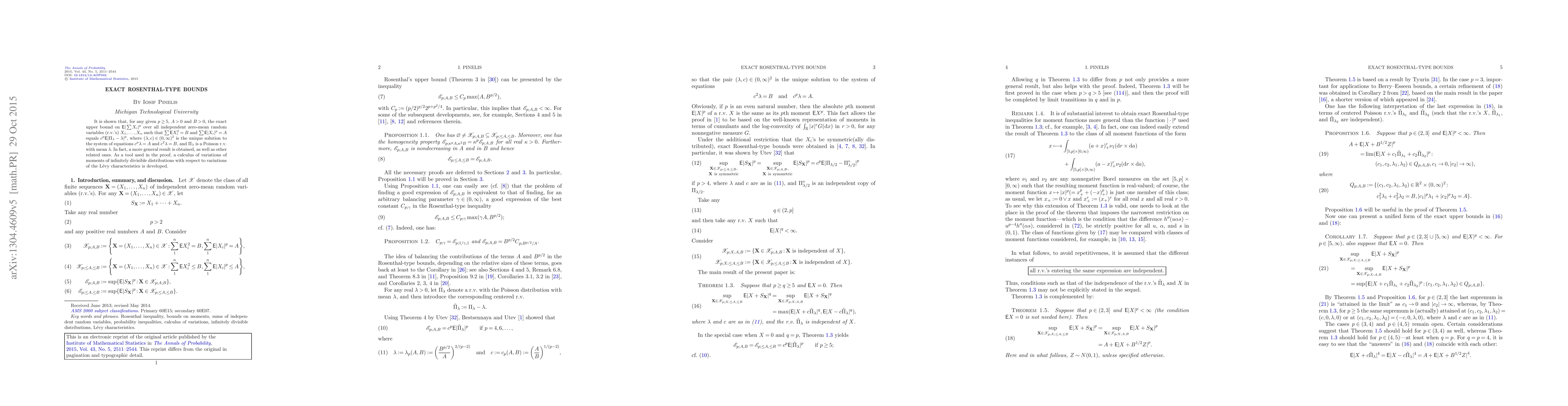 It is shown that, for any given $p\ge5$, $A>0$ and $B>0$, the exact upper bound on $\mathsf{E}|\sum X_i|^p$ over all independent zero-mean random variables (r.v.'s) $X_1,\ldots,X_n$ such that $\sum\mathsf{E}X_i^2=B$ and $\sum\mathsf{E}|X_i|^p=A$ equals $c^p\mathsf{E}|\Pi_{\lambda}-\lambda|^p$, where $(\lambda ,c)\in(0,\infty)^2$ is the unique solution to the system of equations $c^p\lambda=A$ and $c^2\lambda=B$, and $\Pi_{\lambda}$ is a Poisson r.v. with mean $\lambda$. In fact, a more general result is obtained, as well as other related ones. As a tool used in the proof, a calculus of variations of moments of infinitely divisible distributions with respect to variations of the L\'{e}vy characteristics is developed.