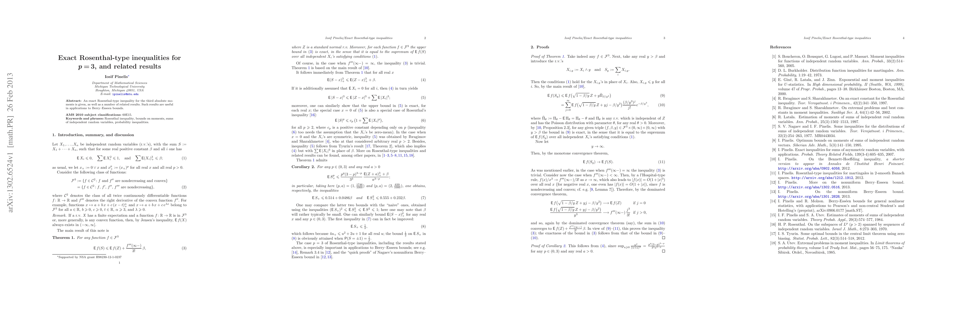 An exact Rosenthal-type inequality for the third absolute moments is given, as well as a number of related results. Such results are useful in applications to Berry--Esseen bounds.