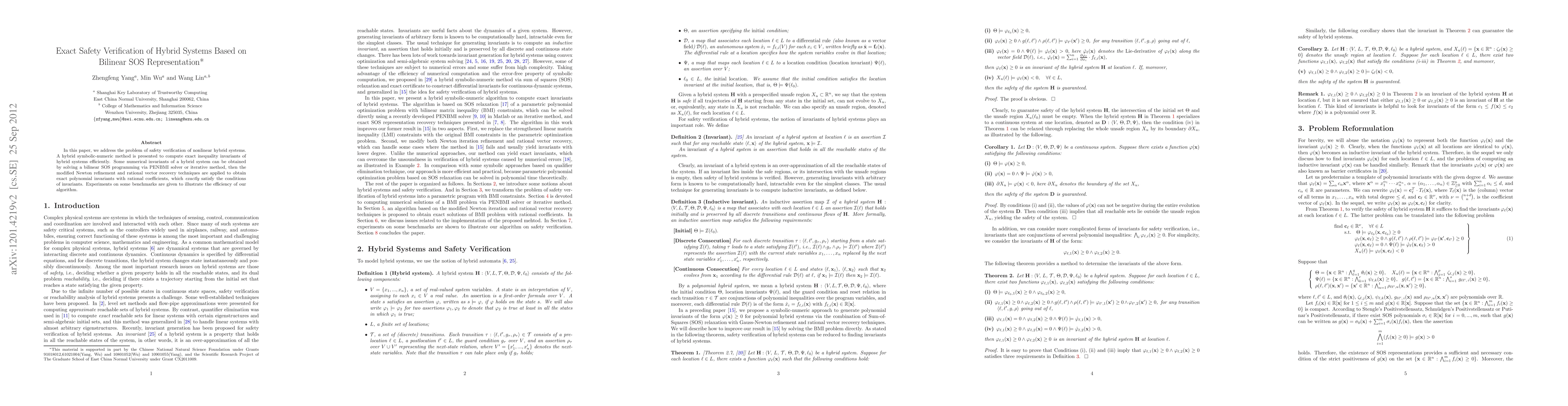 This paper presents a hybrid symbolic-numeric method for exact safety verification of nonlinear hybrid systems, utilizing bilinear SOS programming to compute inequality invariants efficiently. The method employs PENBMI solver and iterative refinement techniques to derive exact polynomial invariants with rational coefficients.