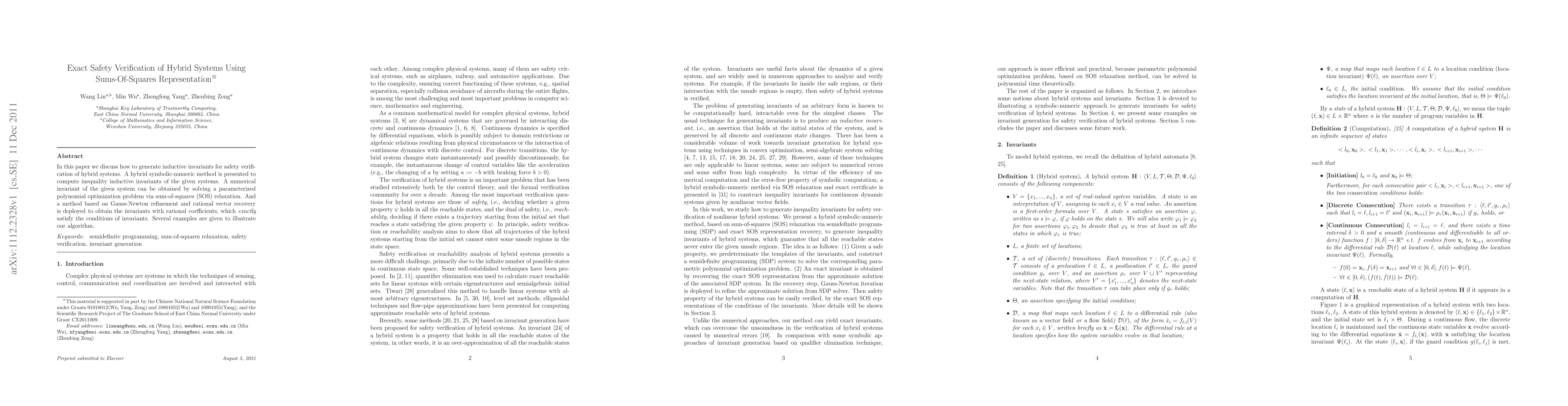 This paper presents a hybrid symbolic-numeric method for generating exact inductive invariants for safety verification of hybrid systems, utilizing sum-of-squares (SOS) relaxation and Gauss-Newton refinement to obtain rational invariants, illustrated through several examples.