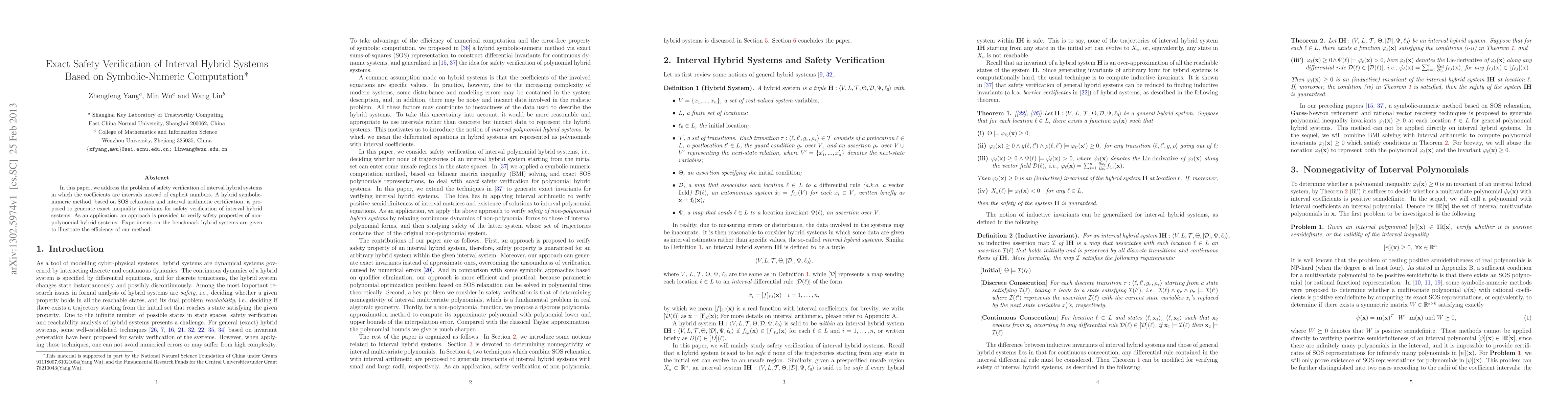 This paper proposes a hybrid symbolic-numeric method for exact safety verification of interval hybrid systems using SOS relaxation and interval arithmetic. The method generates exact inequality invariants and is demonstrated through experiments on benchmark systems.