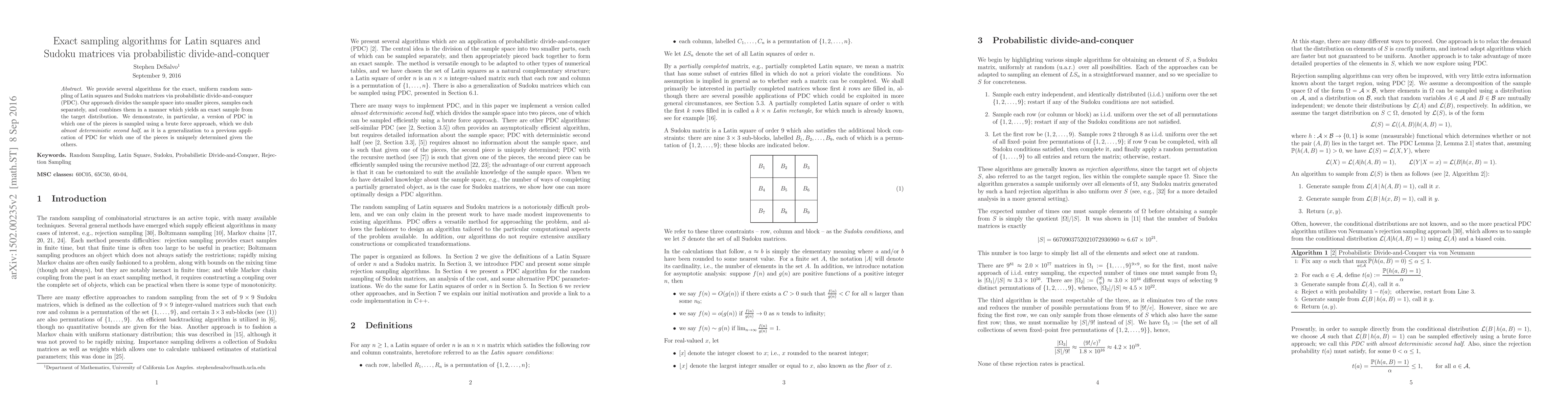This paper presents algorithms for exact, uniform random sampling of Latin squares and Sudoku matrices using probabilistic divide-and-conquer (PDC). The approach divides the sample space into smaller parts, samples each separately, and combines them to yield an exact sample from the target distribution, including a novel "almost deterministic second half" method.