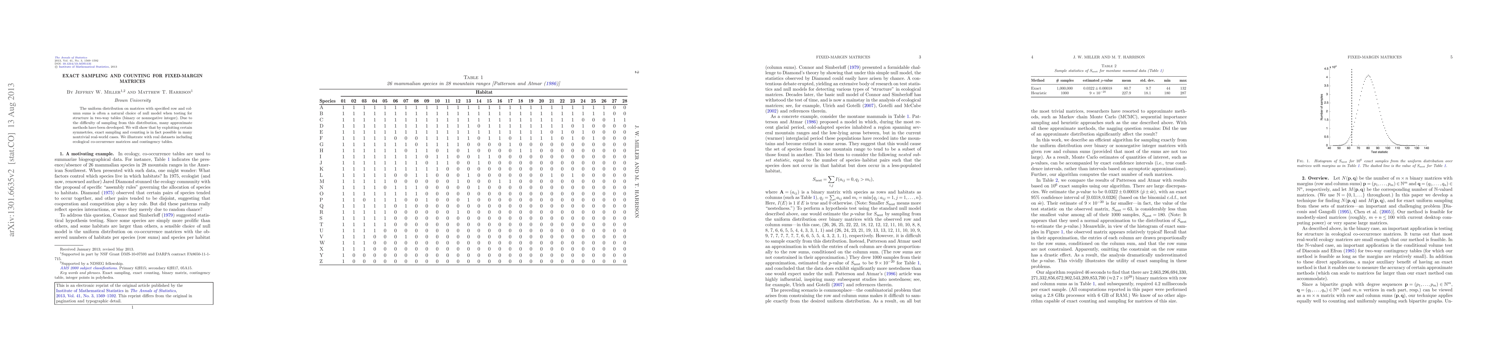 This paper demonstrates that exact sampling and counting from the uniform distribution on matrices with fixed row and column sums can be achieved through exploiting symmetries, providing a method applicable to real datasets like ecological co-occurrence matrices and contingency tables. This contrasts with previously used approximate methods.