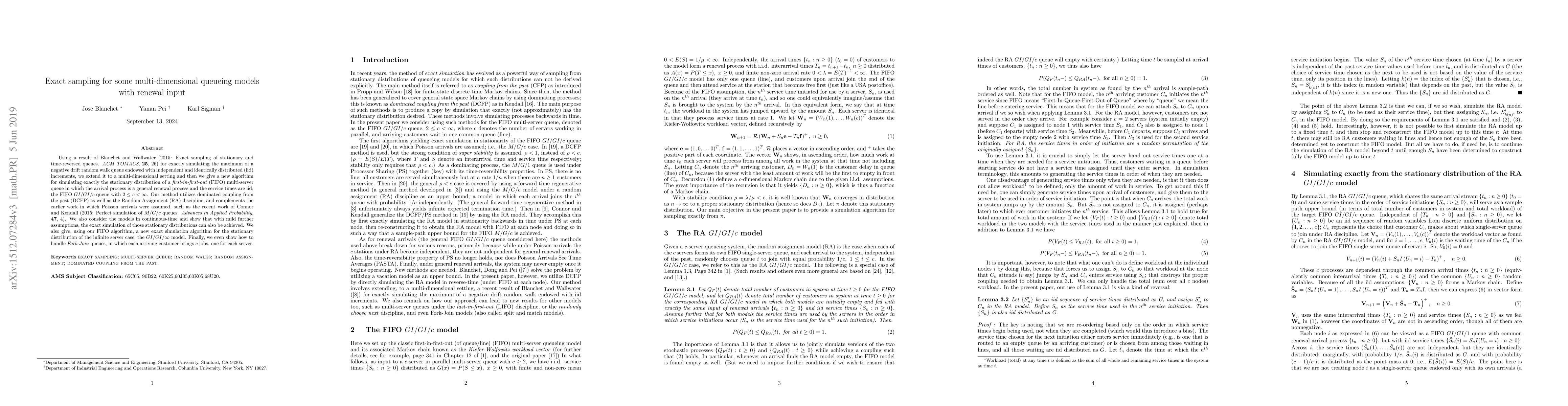 Researchers developed an algorithm for exactly simulating stationary distributions of multi-dimensional queueing models with renewal input, extending previous work on GI/GI/c queues to include general renewal processes and iid service times.