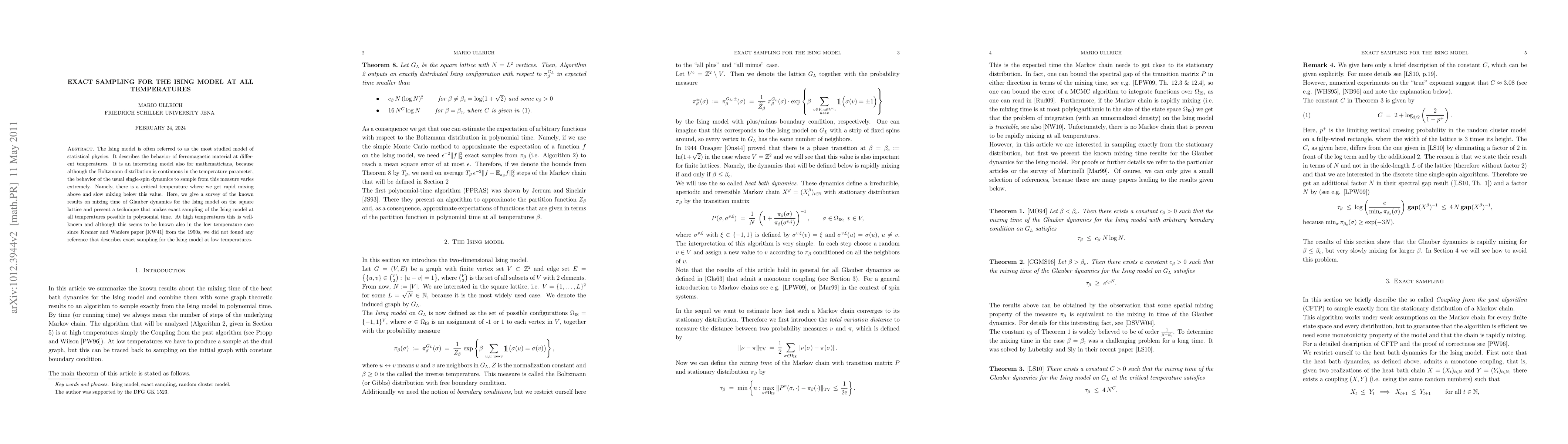 This paper surveys the mixing time of Glauber dynamics for the Ising model and introduces a novel technique enabling exact sampling of the Ising model at all temperatures in polynomial time, addressing a gap in existing literature for low-temperature exact sampling.
