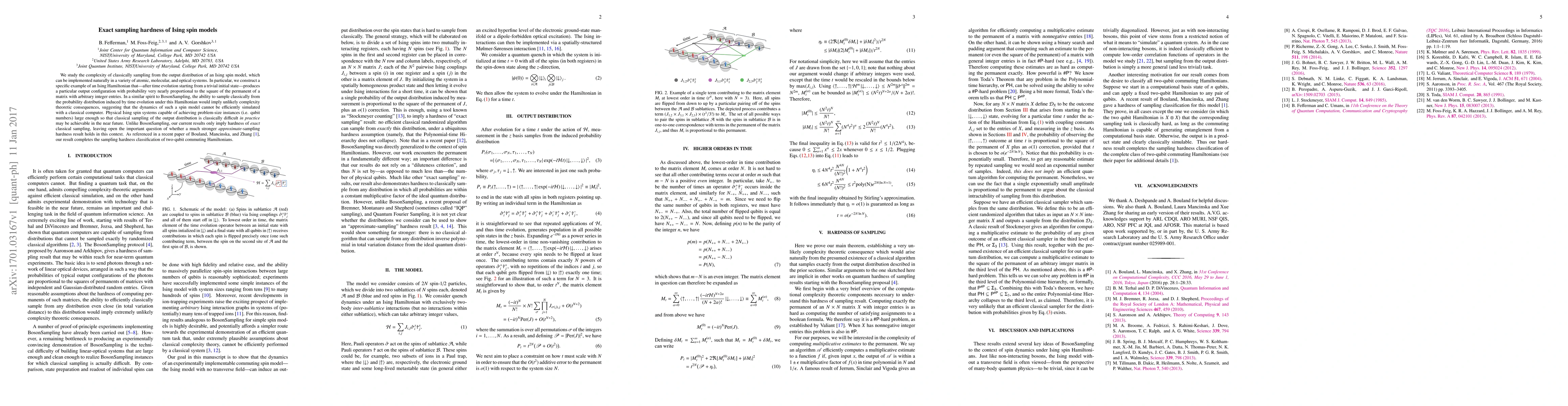 This paper investigates the complexity of classically sampling from the output distribution of Ising spin models, demonstrating that a specific Ising Hamiltonian's time evolution results in configurations proportional to the square of a matrix's permanent. The exact classical sampling hardness suggests that simulating such dynamics efficiently on classical computers is unlikely, completing the classification of two-qubit commuting Hamiltonians' sampling hardness.