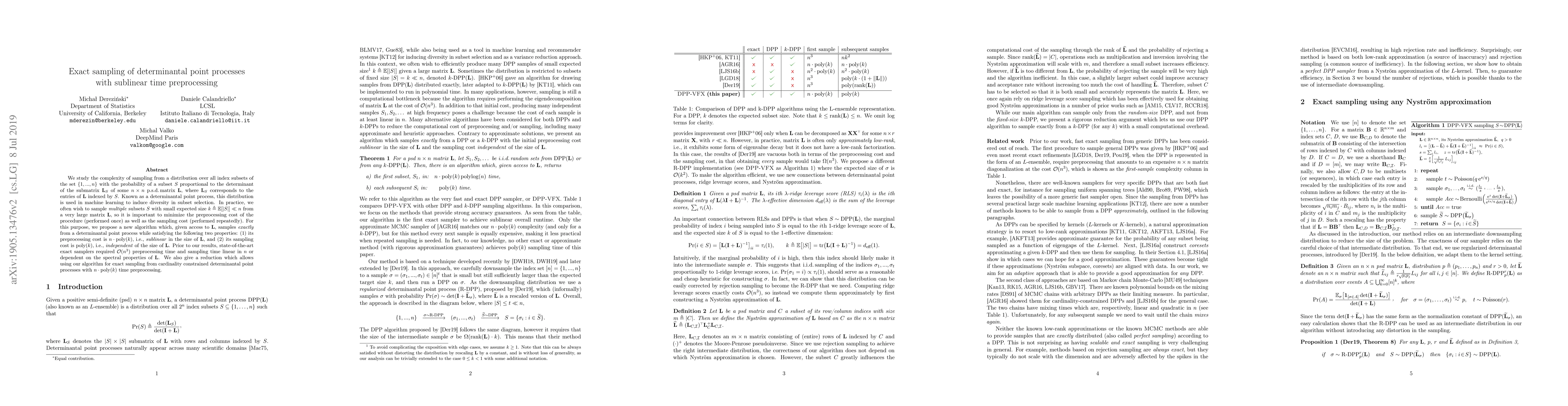 This paper proposes a new algorithm for exact sampling from determinantal point processes with sublinear preprocessing time and polynomial sampling cost. The algorithm achieves preprocessing cost of $n \cdot \text{poly}(k)$ and sampling cost of $\text{poly}(k)$, significantly improving upon previous methods that required $O(n^3)$ preprocessing time and linear sampling time.