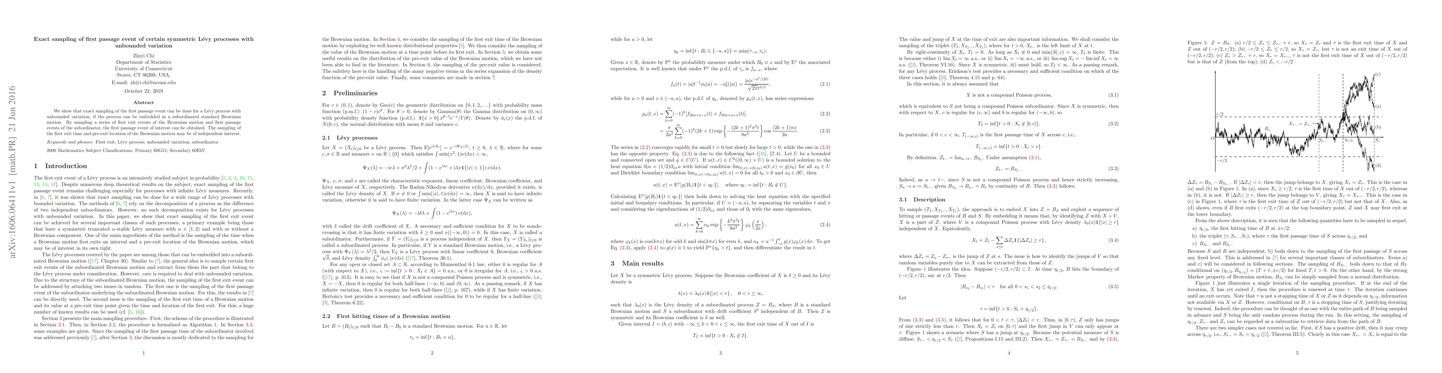 We show that exact sampling of the first passage event can be done for a Levy process with unbounded variation, if the process can be embedded in a subordinated standard Brownian motion. By sampling a series of first exit events of the Brownian motion and first passage events of the subordinator, the first passage event of interest can be obtained. The sampling of the first exit time and pre-exit location of the Brownian motion may be of independent interest.