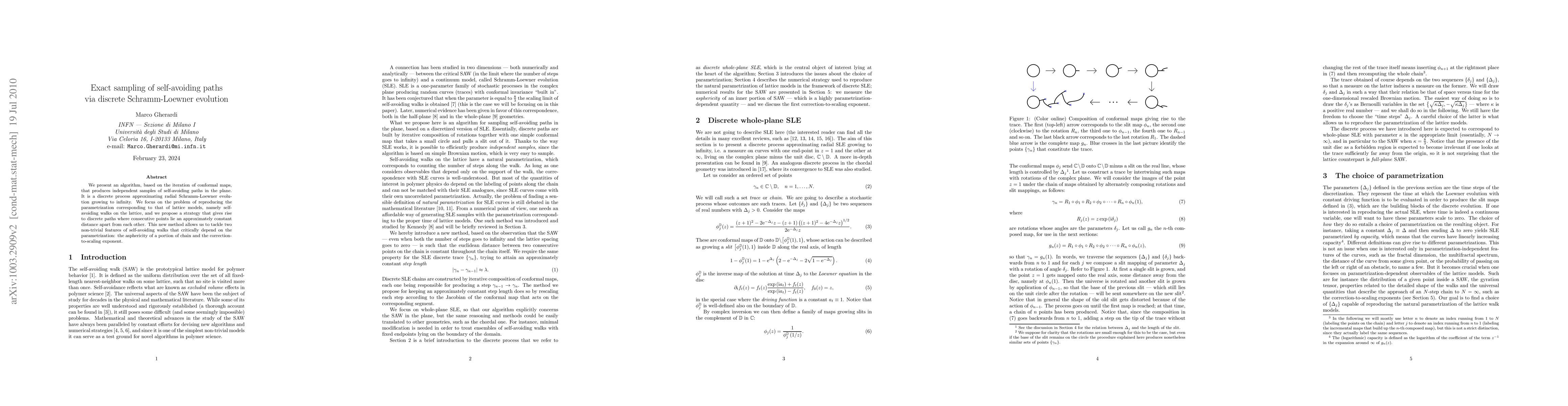 This paper introduces an algorithm using conformal maps to sample self-avoiding paths in the plane, approximating radial Schramm-Loewner evolution. The method aims to reproduce the parametrization of lattice models, ensuring consecutive points maintain a nearly constant distance, addressing asphericity and correction-to-scaling exponent.