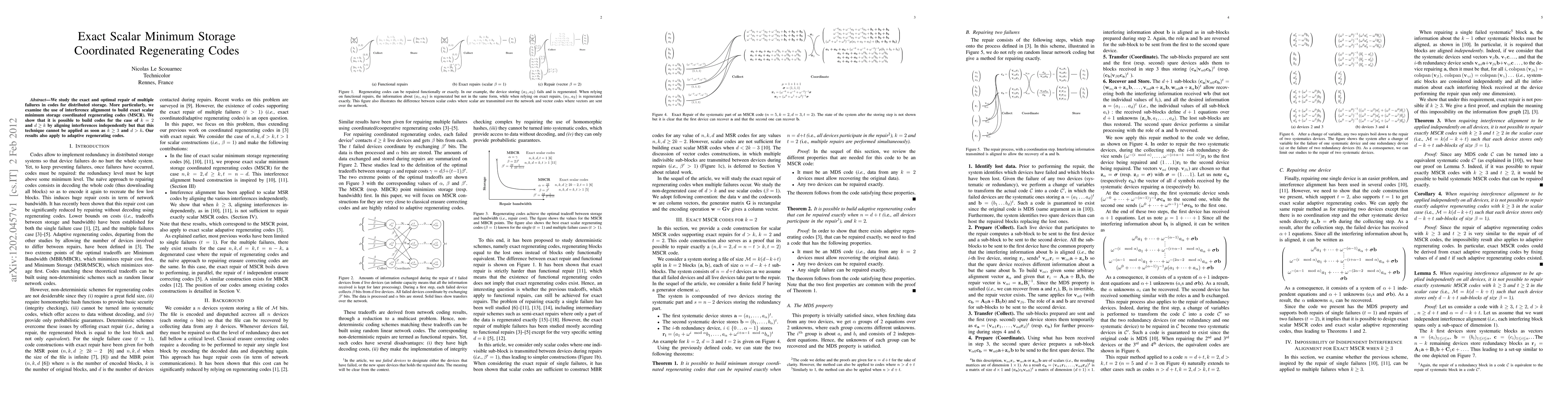 We study the exact and optimal repair of multiple failures in codes for distributed storage. More particularly, we examine the use of interference alignment to build exact scalar minimum storage coordinated regenerating codes (MSCR). We show that it is possible to build codes for the case of k = 2 and d > k by aligning interferences independently but that this technique cannot be applied as soon as k > 2 and d > k. Our results also apply to adaptive regenerating codes.