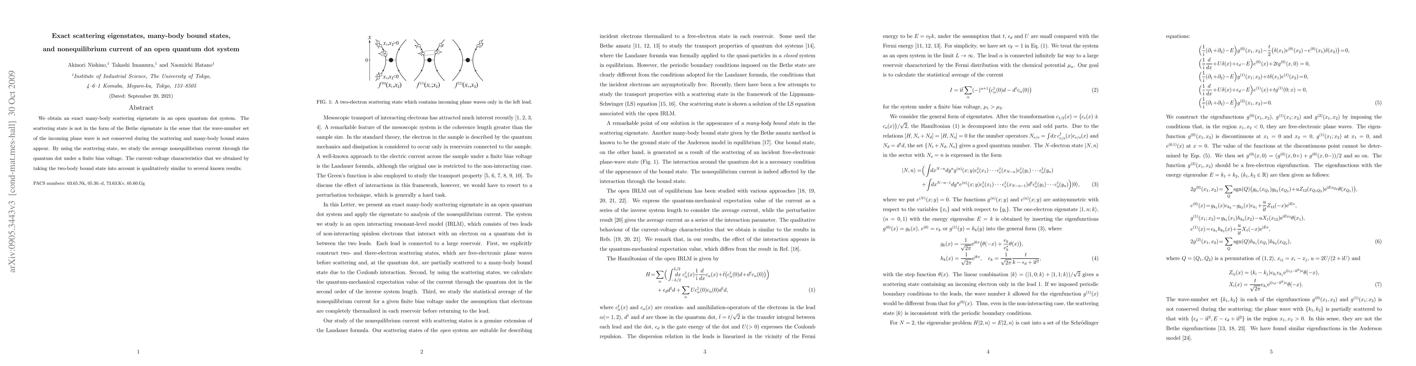 This paper presents an exact many-body scattering eigenstate for an open quantum dot system, where many-body bound states emerge and wave-number conservation is not maintained. It also investigates the nonequilibrium current through the quantum dot under a finite bias, finding current-voltage characteristics qualitatively similar to known results.