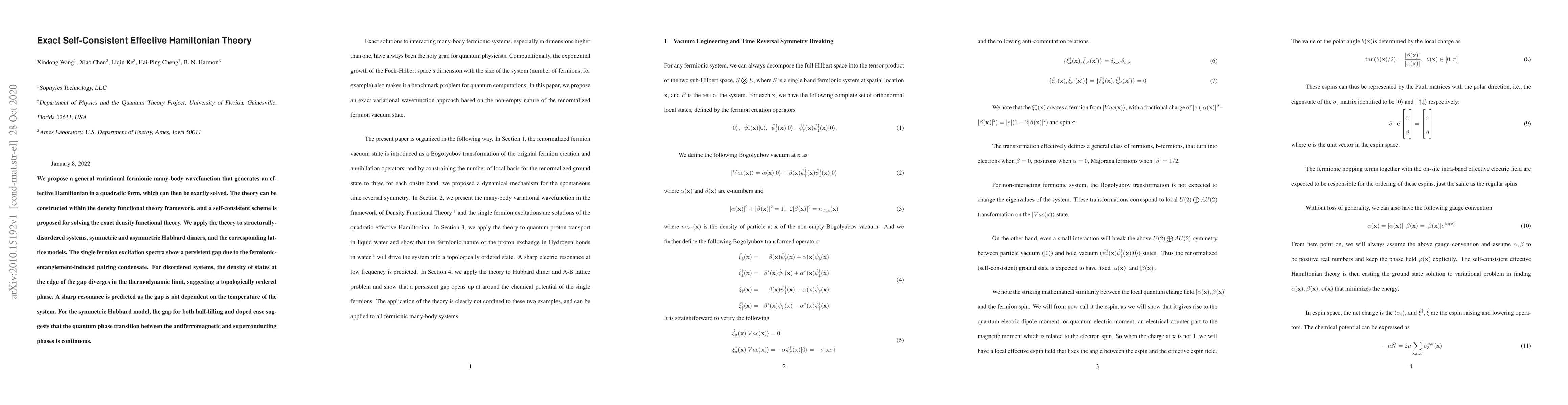 We propose a general variational fermionic many-body wavefunction that generates an effective Hamiltonian in a quadratic form, which can then be exactly solved. The theory can be constructed within the density functional theory framework, and a self-consistent scheme is proposed for solving the exact density functional theory. We apply the theory to structurally-disordered systems, symmetric and asymmetric Hubbard dimers, and the corresponding lattice models. The single fermion excitation spectra show a persistent gap due to the fermionic-entanglement-induced pairing condensate. For disordered systems, the density of states at the edge of the gap diverges in the thermodynamic limit, suggesting a topologically ordered phase. A sharp resonance is predicted as the gap is not dependent on the temperature of the system. For the symmetric Hubbard model, the gap for both half-filling and doped case suggests that the quantum phase transition between the antiferromagnetic and superconducting phases is continuous.