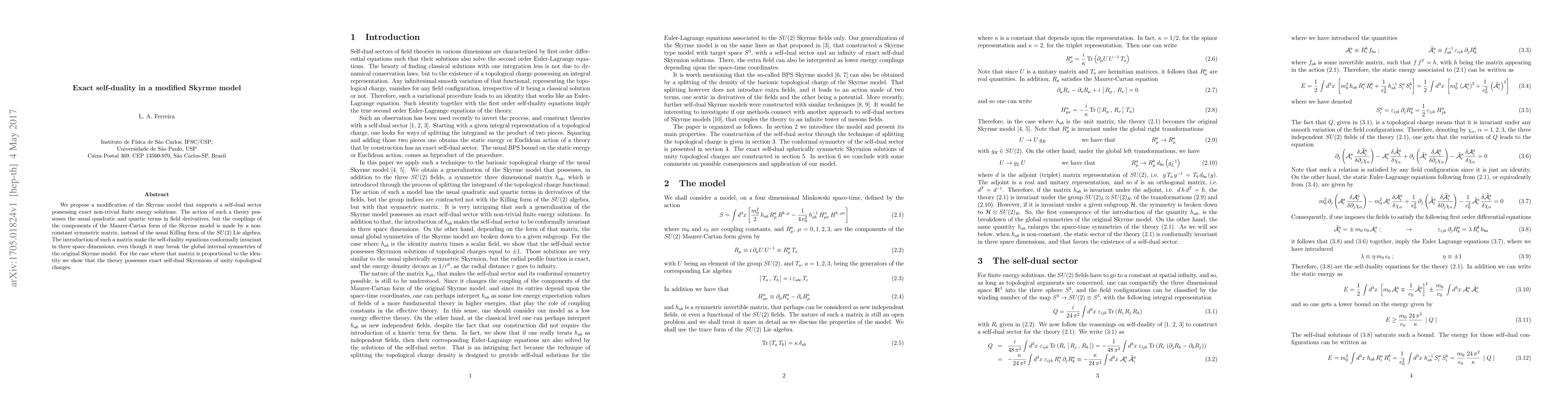 We propose a modification of the Skyrme model that supports a self-dual sector possessing exact non-trivial finite energy solutions. The action of such a theory possesses the usual quadratic and quartic terms in field derivatives, but the couplings of the components of the Maurer-Cartan form of the Skyrme model is made by a non-constant symmetric matrix, instead of the usual Killing form of the SU(2) Lie algebra. The introduction of such a matrix make the self-duality equations conformally invariant in three space dimensions, even though it may break the global internal symmetries of the original Skyrme model. For the case where that matrix is proportional to the identity we show that the theory possesses exact self-dual Skyrmions of unity topological charges.