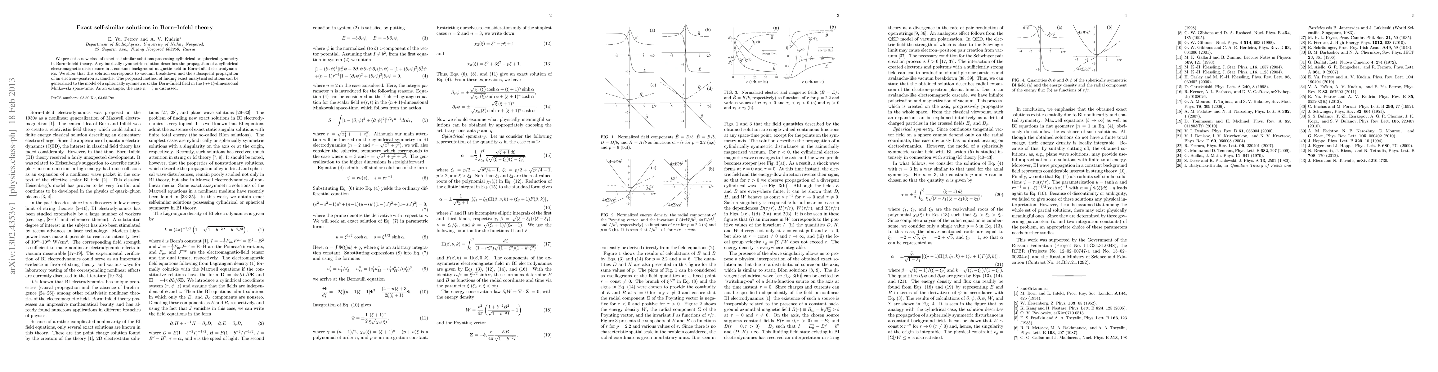 This paper introduces exact self-similar solutions in Born-Infeld theory with cylindrical or spherical symmetry, detailing a cylindrical solution describing electromagnetic disturbances in a constant magnetic field leading to vacuum breakdown and electron-positron avalanches. The method can be extended to spherically symmetric scalar fields in higher-dimensional space-time, exemplified by the $n=3$ case.