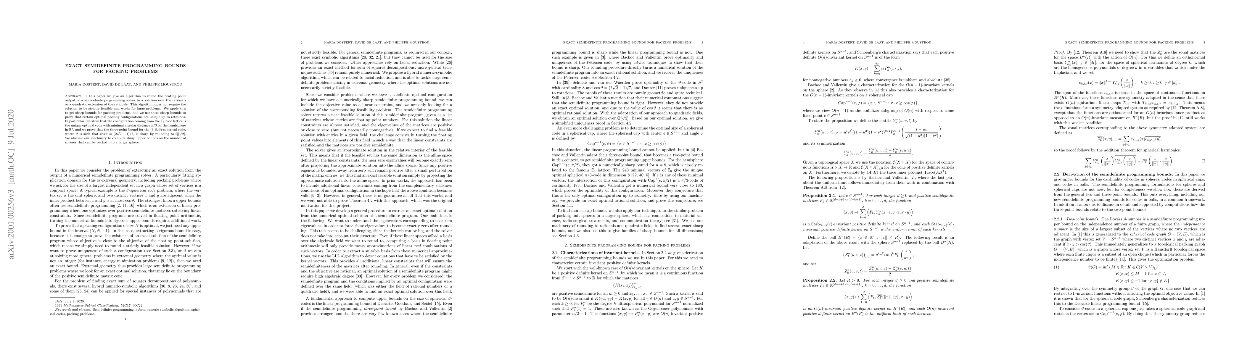 This paper presents an algorithm to convert semidefinite programming solutions into rational or quadratic rational solutions, providing exact bounds for packing problems. It demonstrates the uniqueness of optimal packing configurations, notably proving the $\mathsf{E}_8$ root lattice configuration's optimality and the sharpness of the three-point bound for a specific spherical code.
