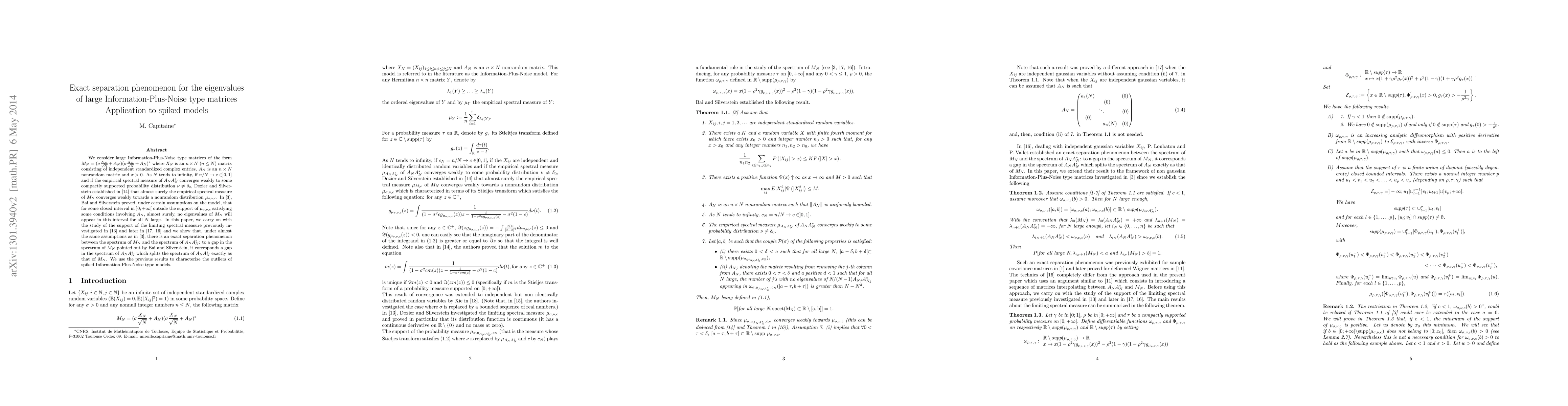This paper investigates large Information-Plus-Noise type matrices and demonstrates an exact separation phenomenon between their eigenvalues and those of the underlying nonrandom matrix $A_N A_N^*$. It shows that gaps in the spectrum of $M_N$ correspond to gaps in the spectrum of $A_N A_N^*$, providing a precise characterization of the outliers in spiked models.