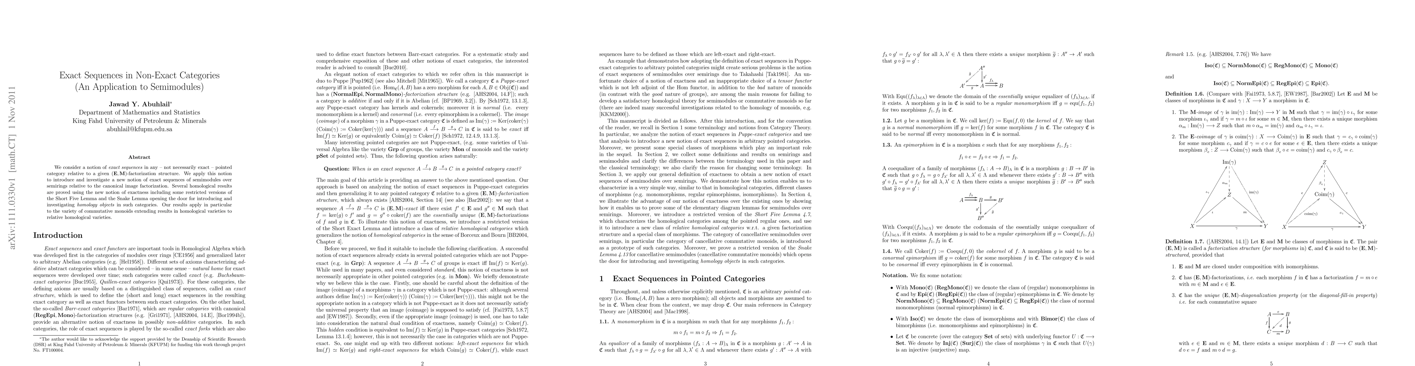 This paper extends the concept of exact sequences to non-exact categories using a (E;M)-factorization structure, applying it to semimodules over semirings. It introduces new homological results, including restricted versions of the Short Five Lemma and the Snake Lemma, and extends these findings to the realm of commutative monoids.