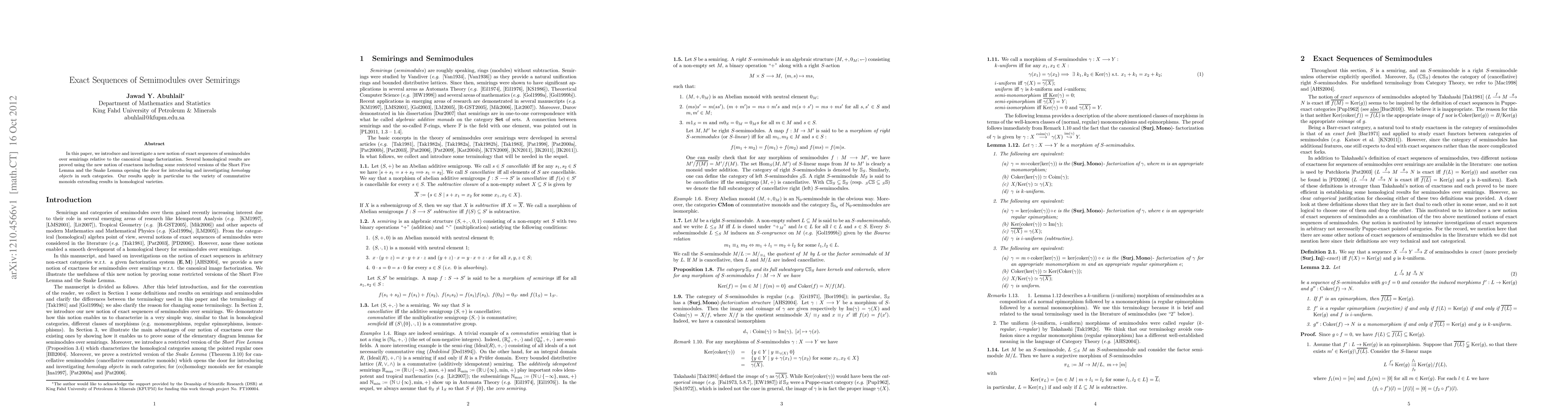 This paper introduces and explores exact sequences of semimodules over semirings using canonical image factorization, proving several homological results such as restricted versions of the Short Five Lemma and the Snake Lemma, and extending these findings to commutative monoids.