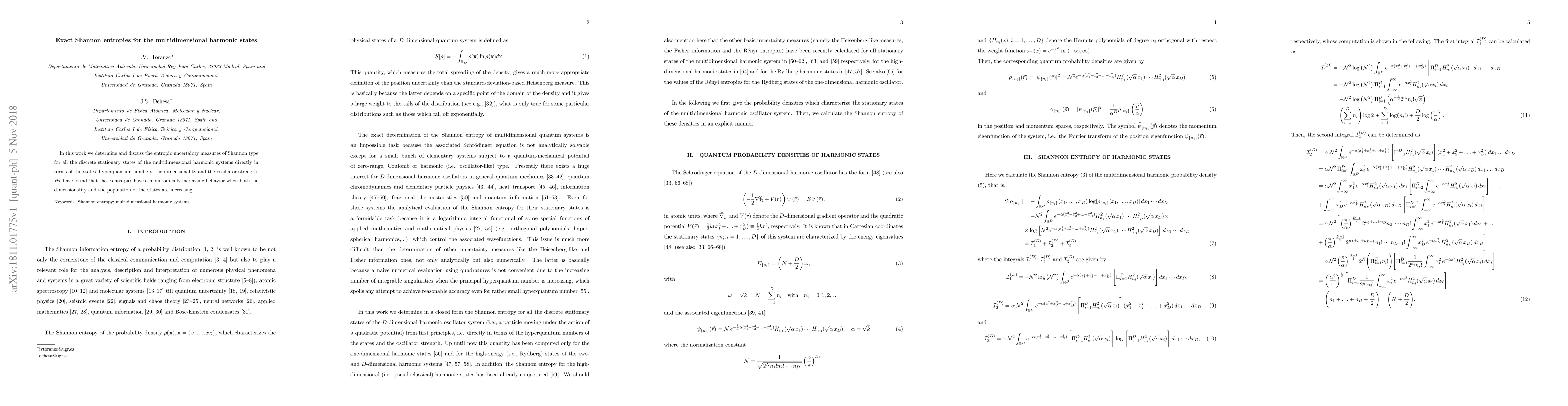 This research determines Shannon entropies for multidimensional harmonic states, revealing a monotonically increasing behavior tied to the states' hyperquantum numbers, dimensionality, and oscillator strength. The findings provide direct entropic uncertainty measures for discrete stationary states.