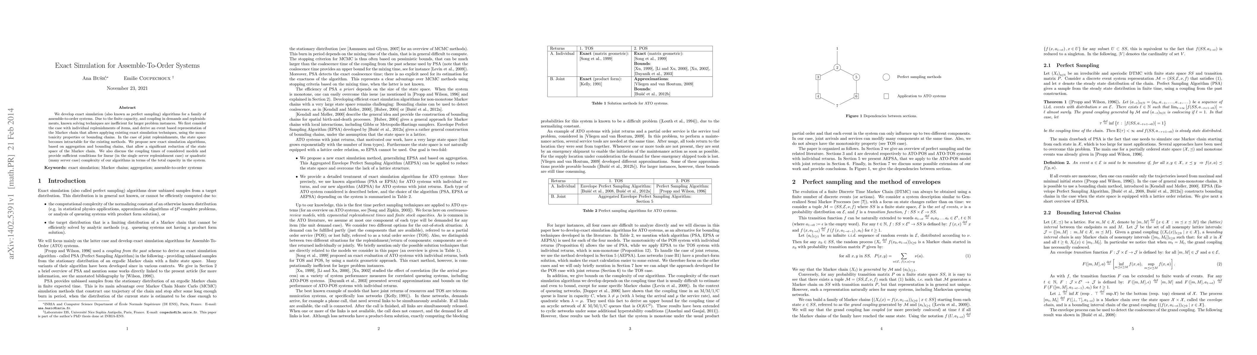 We develop exact simulation (also known as perfect sampling) algorithms for a family of assemble-to-order systems. Due to the finite capacity, and coupling in demands and replenishments, known solving techniques are inefficient for larger problem instances. We first consider the case with individual replenishments of items, and derive an event based representation of the Markov chain that allows applying existing exact simulation techniques, using the monotonicity properties or bounding chains. In the case of joint replenishments, the state space becomes intractable for the existing methods. We propose new exact simulation algorithms, based on aggregation and bounding chains, that allow a significant reduction of the state space of the Markov chain. We also discuss the coupling times of considered models and provide sufficient conditions for linear (in the single server replenishment case) or quadratic (many server case) complexity of our algorithms in terms of the total capacity in the system.