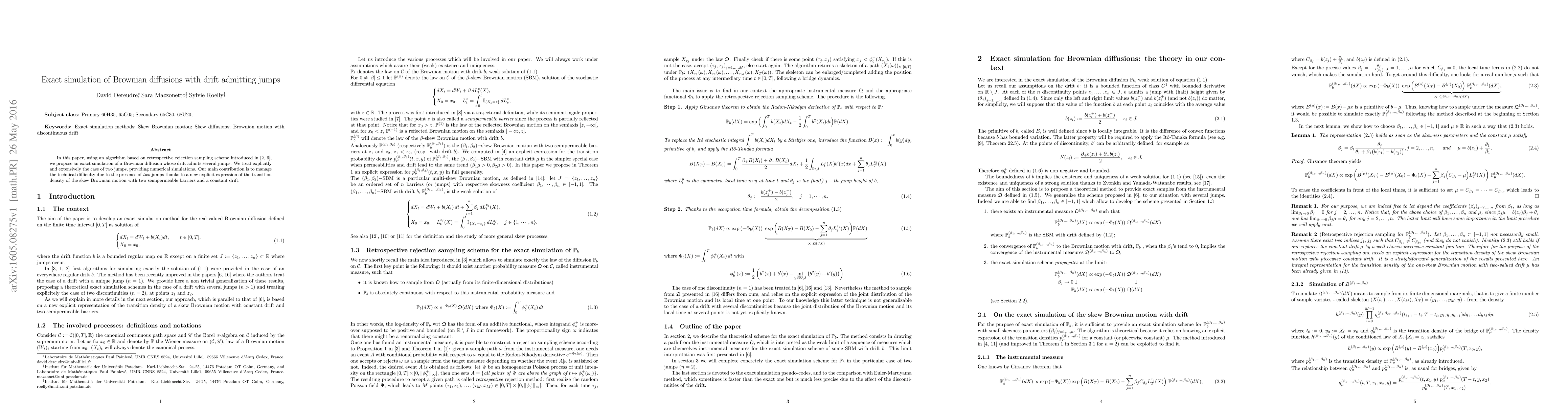 This paper proposes an exact simulation algorithm for Brownian diffusions with jump drift using retrospective rejection sampling, focusing on the case with two jumps. The key contribution is a new explicit expression for the transition density of skew Brownian motion with two semipermeable barriers and a constant drift.