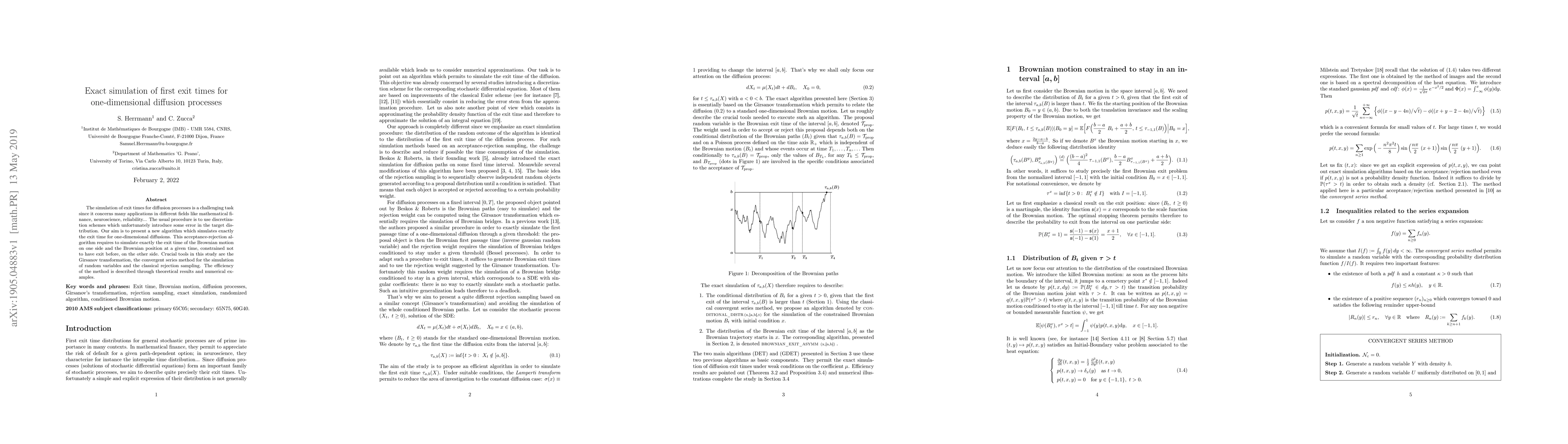 This paper introduces an exact simulation algorithm for first exit times in one-dimensional diffusion processes, avoiding errors introduced by discretization. The method employs an acceptance-rejection algorithm, leveraging the Girsanov transformation and rejection sampling, and is validated through theoretical analysis and numerical examples.