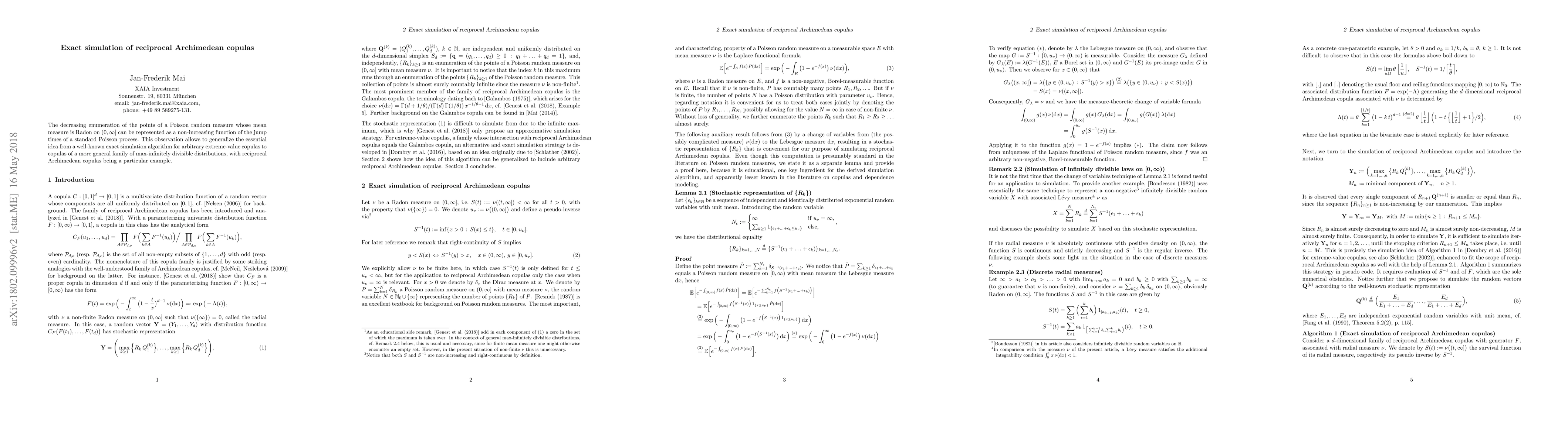 The decreasing enumeration of the points of a Poisson random measure whose mean measure has finite survival function on the positive half-axis can be represented as a non-increasing function of the jump times of a standard Poisson process. This observation allows to generalize the essential idea from a well-known exact simulation algorithm for arbitrary extreme-value copulas to copulas of a more general family of max-infinitely divisible distributions, with reciprocal Archimedean copulas being a particular example.