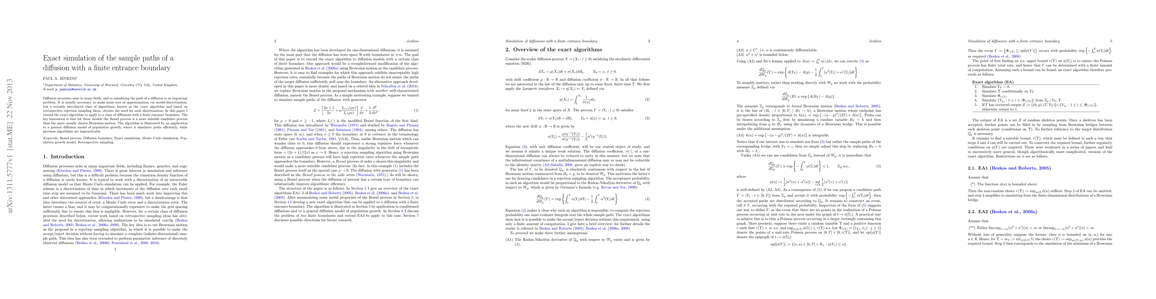 Diffusion processes arise in many fields, and so simulating the path of a diffusion is an important problem. It is usually necessary to make some sort of approximation via model-discretization, but a recently introduced class of algorithms, known as the exact algorithm and based on retrospective rejection sampling ideas, obviate the need for such discretization. In this paper I extend the exact algorithm to apply to a class of diffusions with a finite entrance boundary. The key innovation is that for these models the Bessel process is a more suitable candidate process than the more usually chosen Brownian motion. The algorithm is illustrated by an application to a general diffusion model of population growth, where it simulates paths efficiently, while previous algorithms are impracticable.