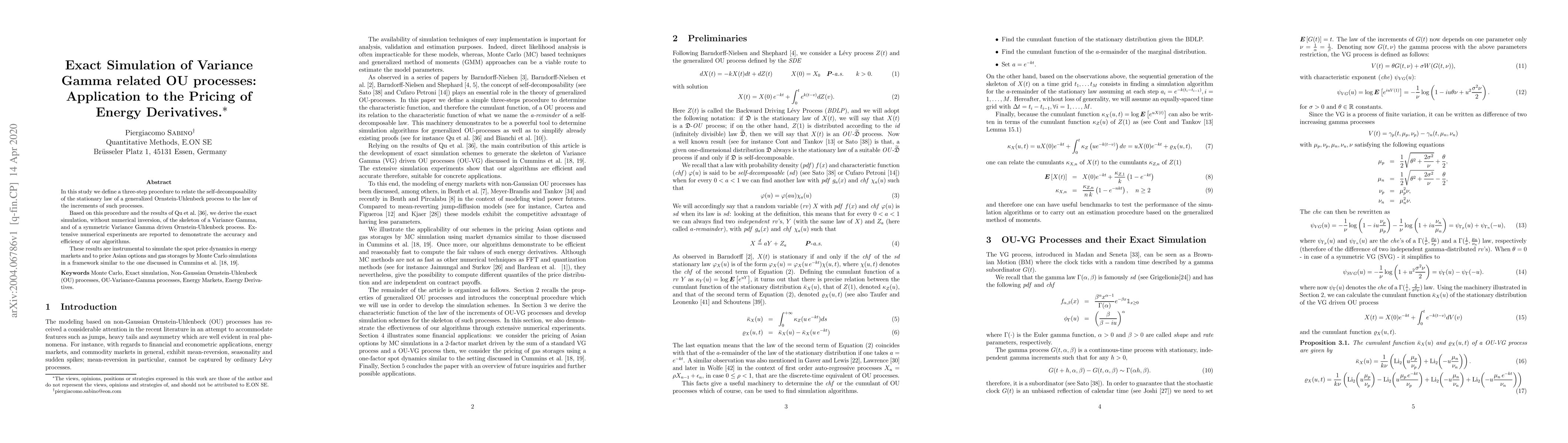 In this study we define a three-step procedure to relate the self-decomposability of the stationary law of a generalized Ornstein-Uhlenbeck process to the law of the increments of such processes. Based on this procedure and the results of Qu et al. (2019), we derive the exact simulation, without numerical inversion, of the skeleton of a Variance Gamma, and of a symmetric Variance Gamma driven Ornstein-Uhlenbeck process. Extensive numerical experiments are reported to demonstrate the accuracy and efficiency of our algorithms. These results are instrumental to simulate the spot price dynamics in energy markets and to price Asian options and gas storages by Monte Carlo simulations in a framework similar to the one discussed in Cummins et al. (2017, 2018).
