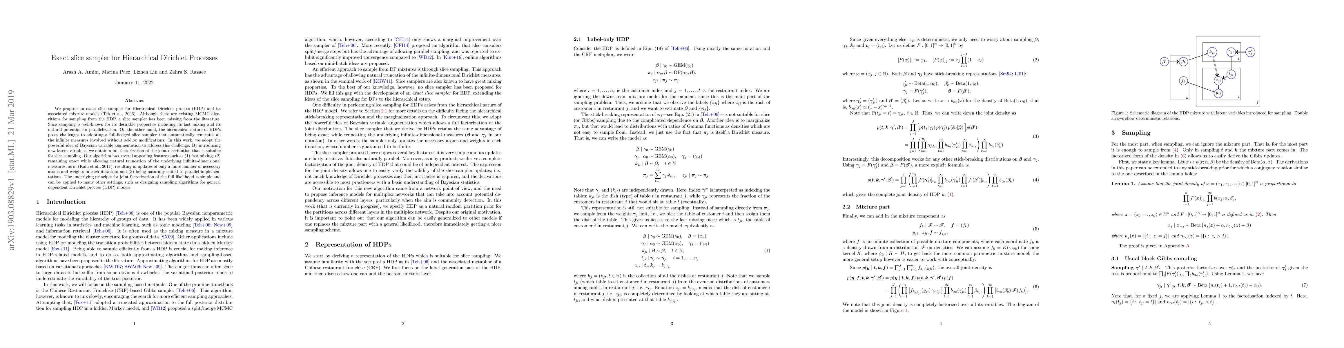 This paper proposes an exact slice sampler for Hierarchical Dirichlet Processes (HDP) that addresses the challenges of the HDP's hierarchical nature through Bayesian variable augmentation. The algorithm achieves fast mixing, exact sampling, and natural suitability for parallel implementations.