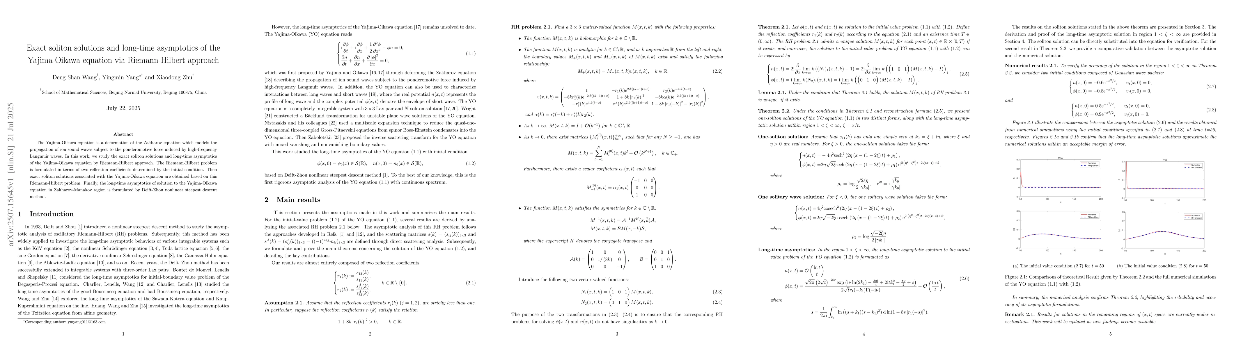 This research presents exact soliton solutions for the Yajima-Oikawa equation, modeling ion sound wave propagation, using the Riemann-Hilbert approach. It also derives the long-time asymptotics via the Deift-Zhou nonlinear steepest descent method.