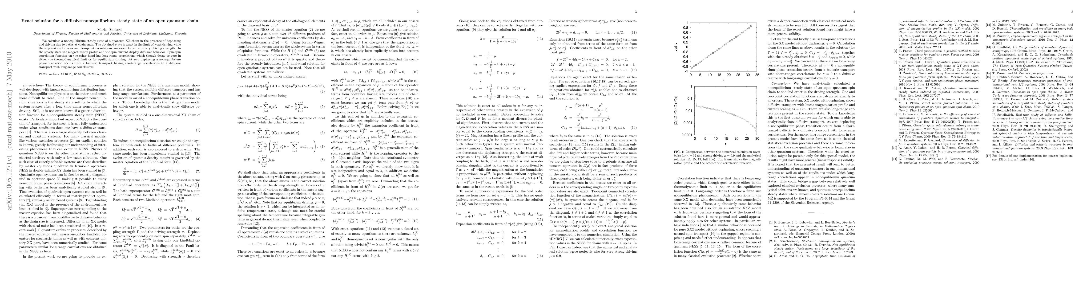 We calculate a nonequilibrium steady state of a quantum XX chain in the presence of dephasing and driving due to baths at chain ends. The obtained state is exact in the limit of weak driving while the expressions for one- and two-point correlations are exact for an arbitrary driving strength. In the steady state the magnetization profile and the spin current display diffusive behavior. Spin-spin correlation function on the other hand has long-range correlations which though decay to zero in either the thermodynamical limit or for equilibrium driving. At zero dephasing a nonequilibrium phase transition occurs from a ballistic transport having short-range correlations to a diffusive transport with long-range correlations.