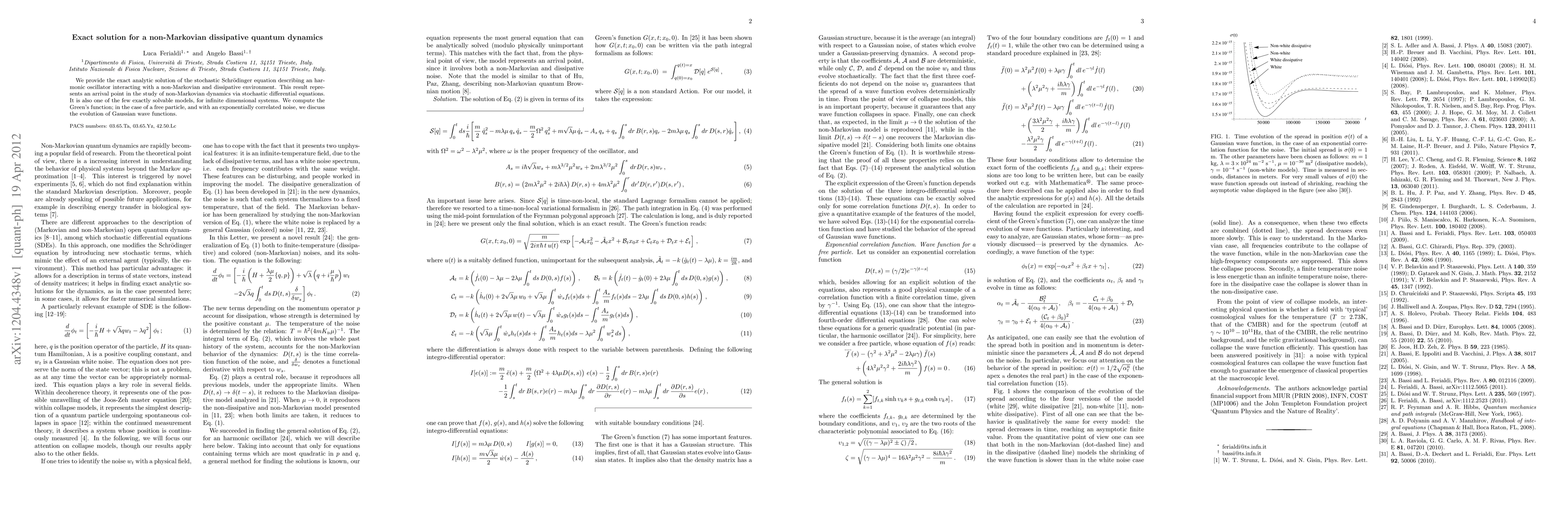 We provide the exact analytic solution of the stochastic Schr\"odinger equation describing an harmonic oscillator interacting with a non-Markovian and dissipative environment. This result represents an arrival point in the study of non-Markovian dynamics via stochastic differential equations. It is also one of the few exactly solvable models, for infinite dimensional systems. We compute the Green's function; in the case of a free particle, and with an exponentially correlated noise, we discuss the evolution of Gaussian wave functions.