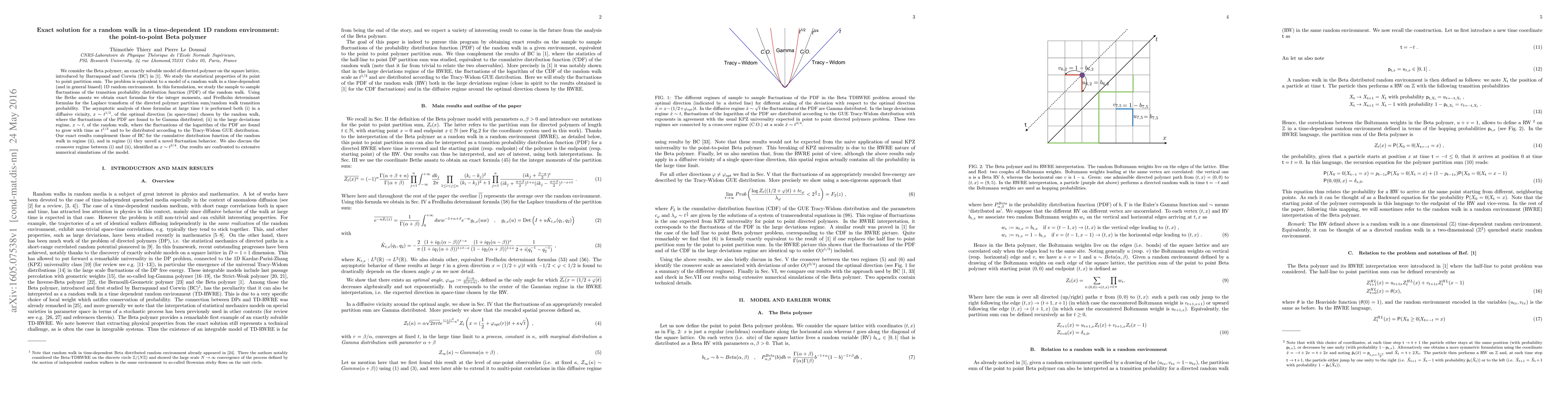 This paper provides an exact solution for the Beta polymer model, a directed polymer on a square lattice, by studying the statistical properties of its point-to-point partition sum. It reveals novel fluctuation behaviors in the diffusive vicinity and large deviations regime of a random walk in a time-dependent environment, using Bethe ansatz and Fredholm determinant formulas.